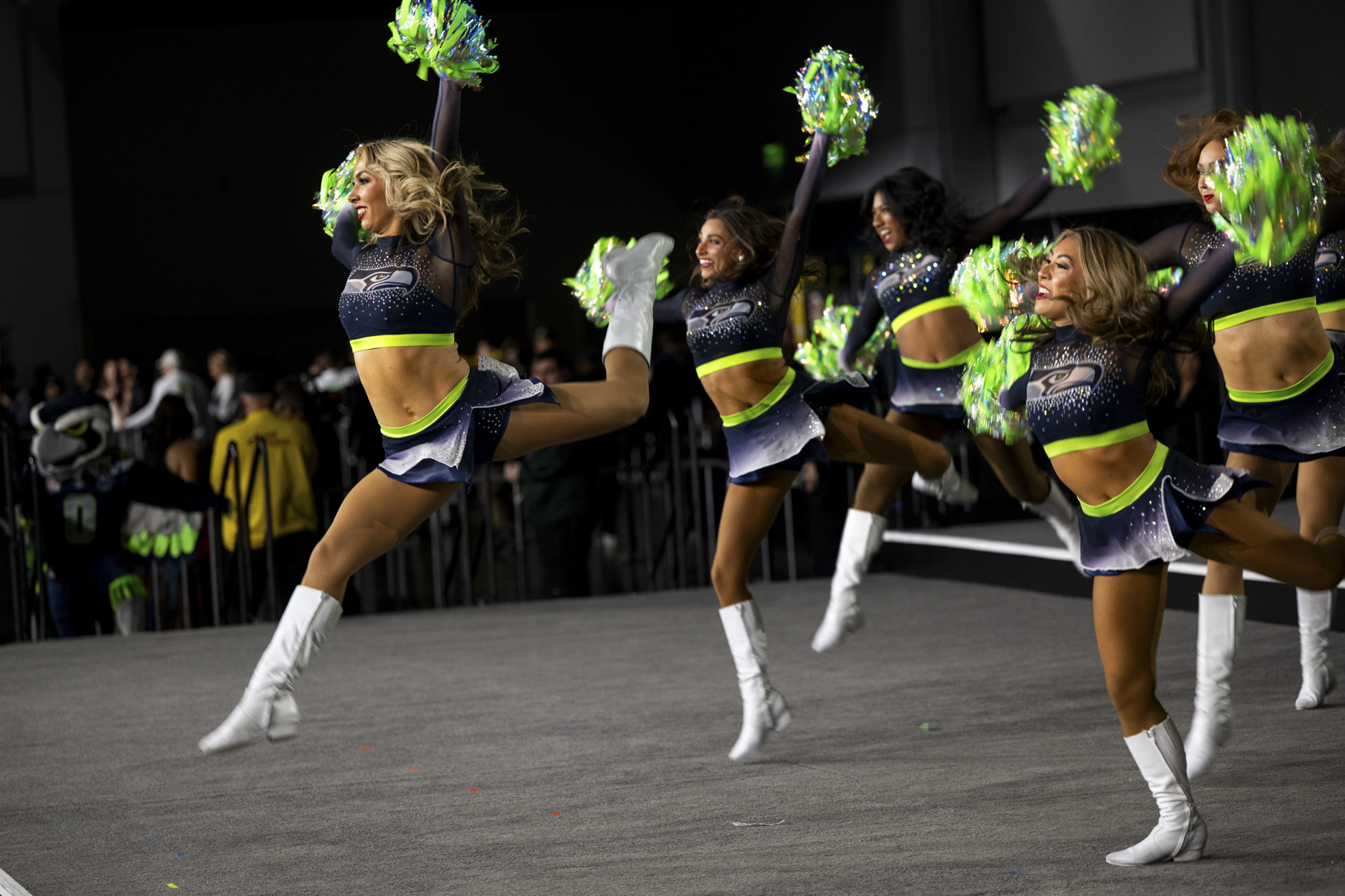 The Seattle Seahawks cheerleaders perform during Super Bowl Opening Night at the San José Convention Center in San José on Feb. 2, 2026. (Beth LaBerge/KQED)
