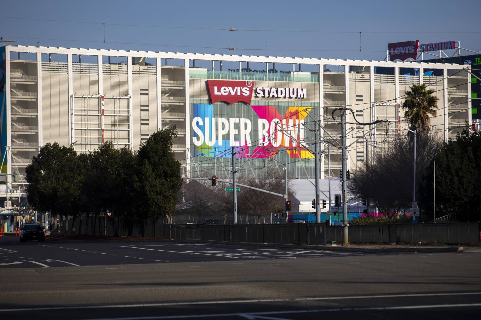 Una pancarta del Super Bowl decora el exterior del Levi’s Stadium en San José el 28 de enero de 2026. (Tâm Vũ/KQED)