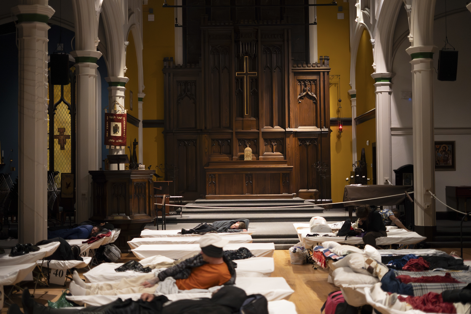 Guests sleep on cots arranged throughout the sanctuary at St. John’s the Evangelist Episcopal Church, where the Gubbio Project is operating an overnight shelter during Super Bowl weekend on Feb. 2, 2026, in San Francisco. (Gustavo Hernandez/KQED)