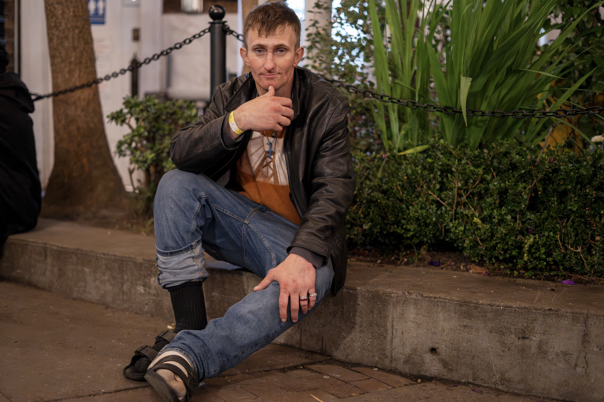 Joshua Wagner sits outside the Gubbio Project at St. John’s the Evangelist Episcopal Church on Feb. 2, 2026, in San Francisco. The program allows unhoused guests to rest inside the church without intake forms or barriers, emphasizing dignity, accessibility and safety. (Gustavo Hernandez/KQED)
