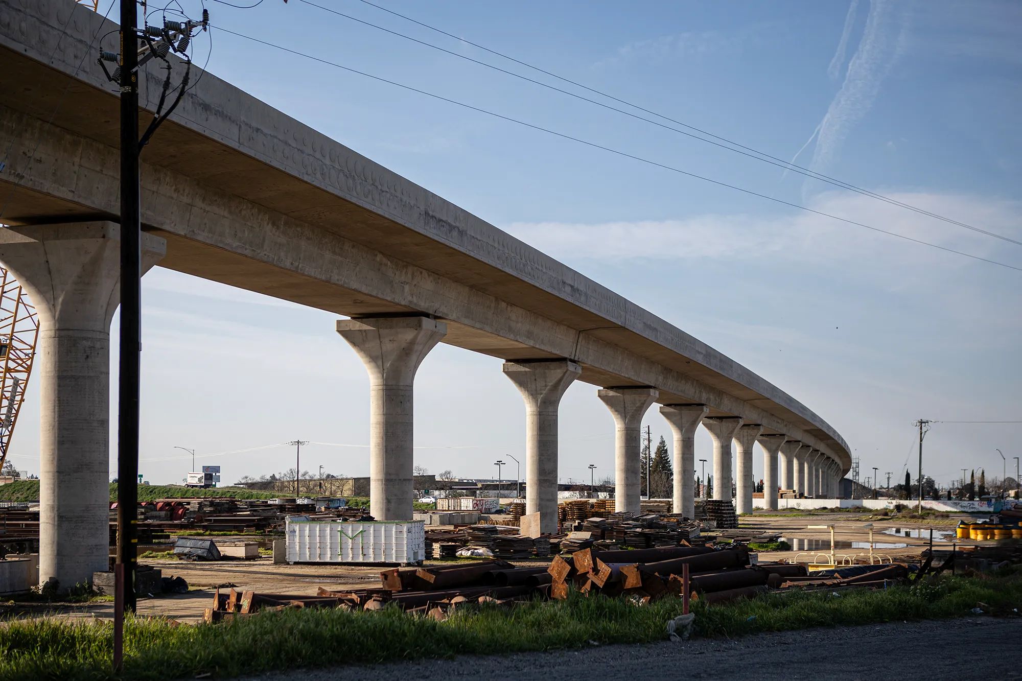 Construction on the high-speed rail project above Highway 99 in south Fresno on March 3, 2023. (Larry Valenzuela/CalMatters via CatchLight Local)
