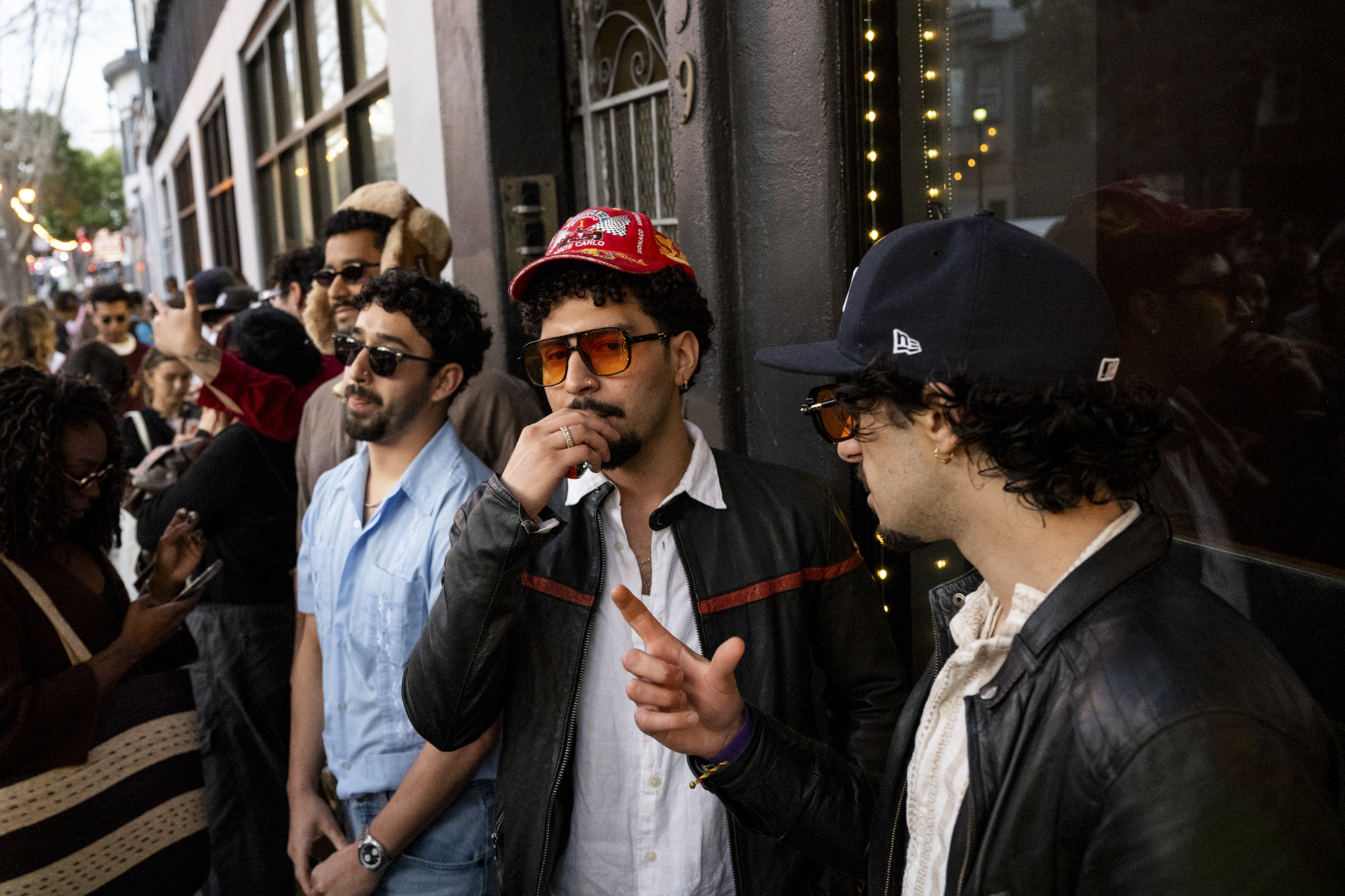 Bad Bunny look-alike contestants wait to enter the competition at Tacolicious in San Francisco on Thursday, Feb. 5, 2026. The contest, organized by Mission Lotería as part of Super Bowl LX week festivities, drew dozens of contestants and hundreds of fans celebrating Bad Bunny ahead of his halftime show on Sunday. (Beth LaBerge/KQED)