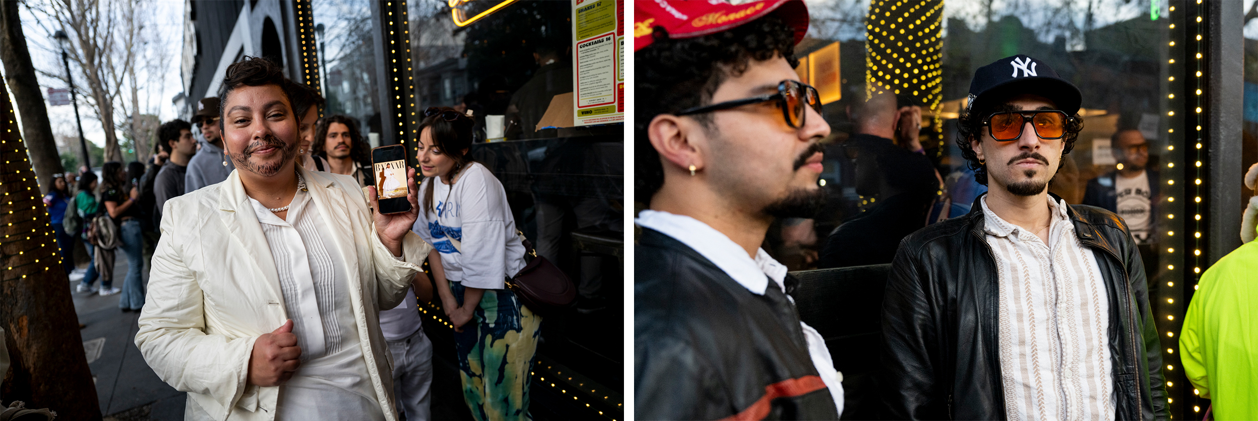 Left: Josie Dominguez-Chand waits to enter a Bad Bunny look-alike contest organized by Mission Lotería at Tacolicious in San Francisco on Thursday, Feb. 5, 2026, ahead of Bad Bunny’s halftime show on Sunday; Right: Bad Bunny look-alike contestants wait to enter the competition at Tacolicious in San Francisco on Thursday, Feb. 5, 2026. (Beth LaBerge/KQED)