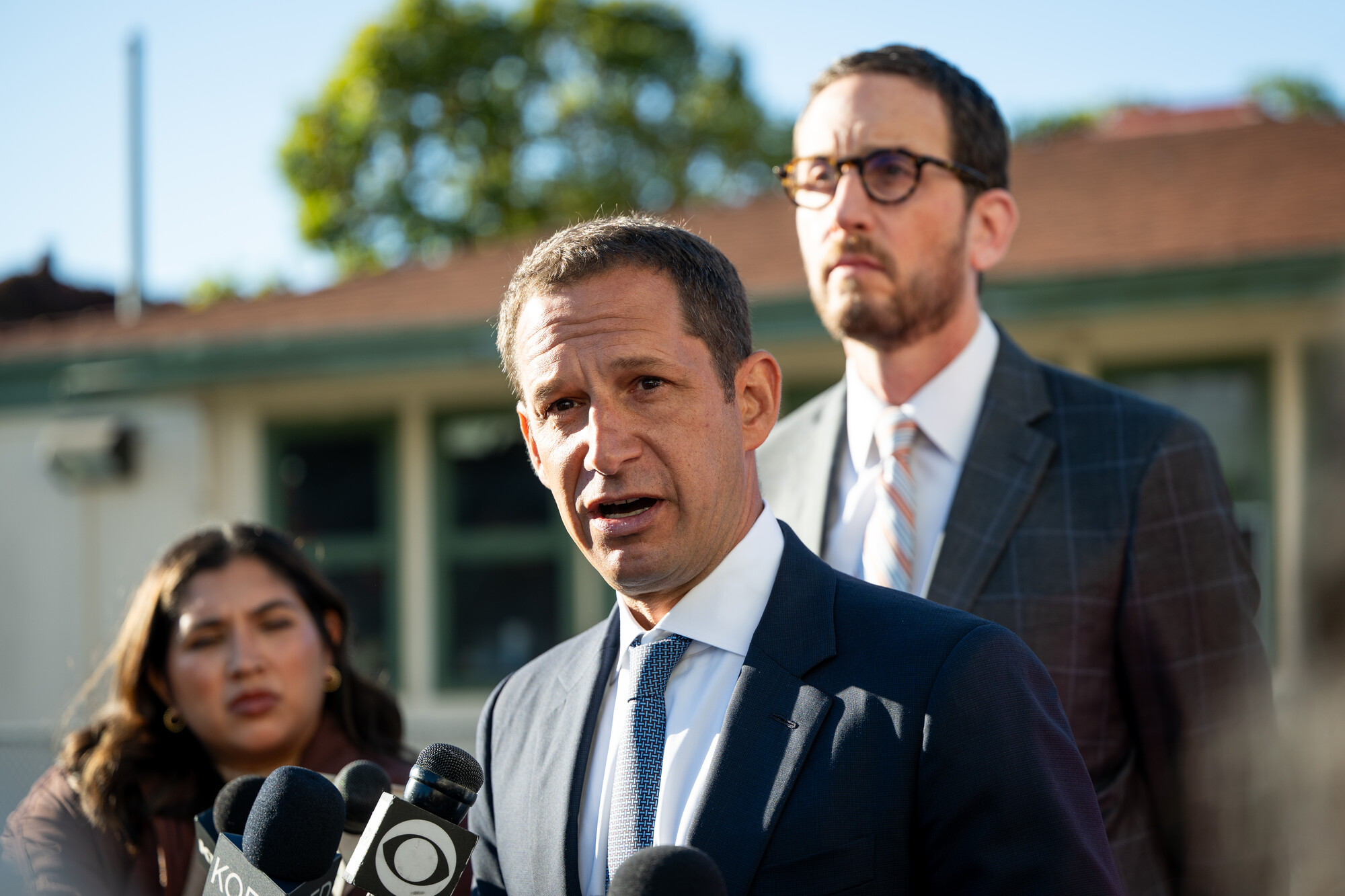 Mayor Daniel Lurie speaks during a press conference at Sanchez Elementary School on the first day of classes for the new school year in San Francisco on Aug. 18, 2025. (Beth LaBerge/KQED)
