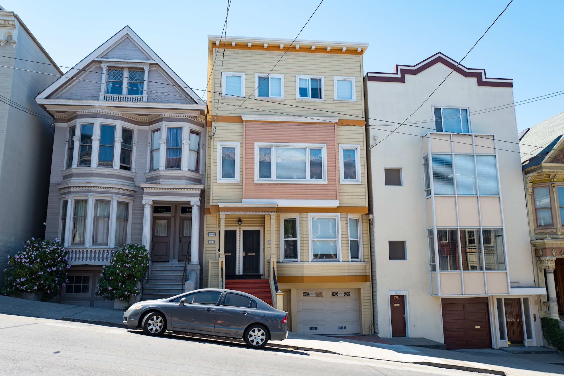 Three Victorian homes in a row on a steep hill on Fillmore Street in San Francisco, California, on Aug. 28, 2016. (Photo via Smith Collection/Getty Images)