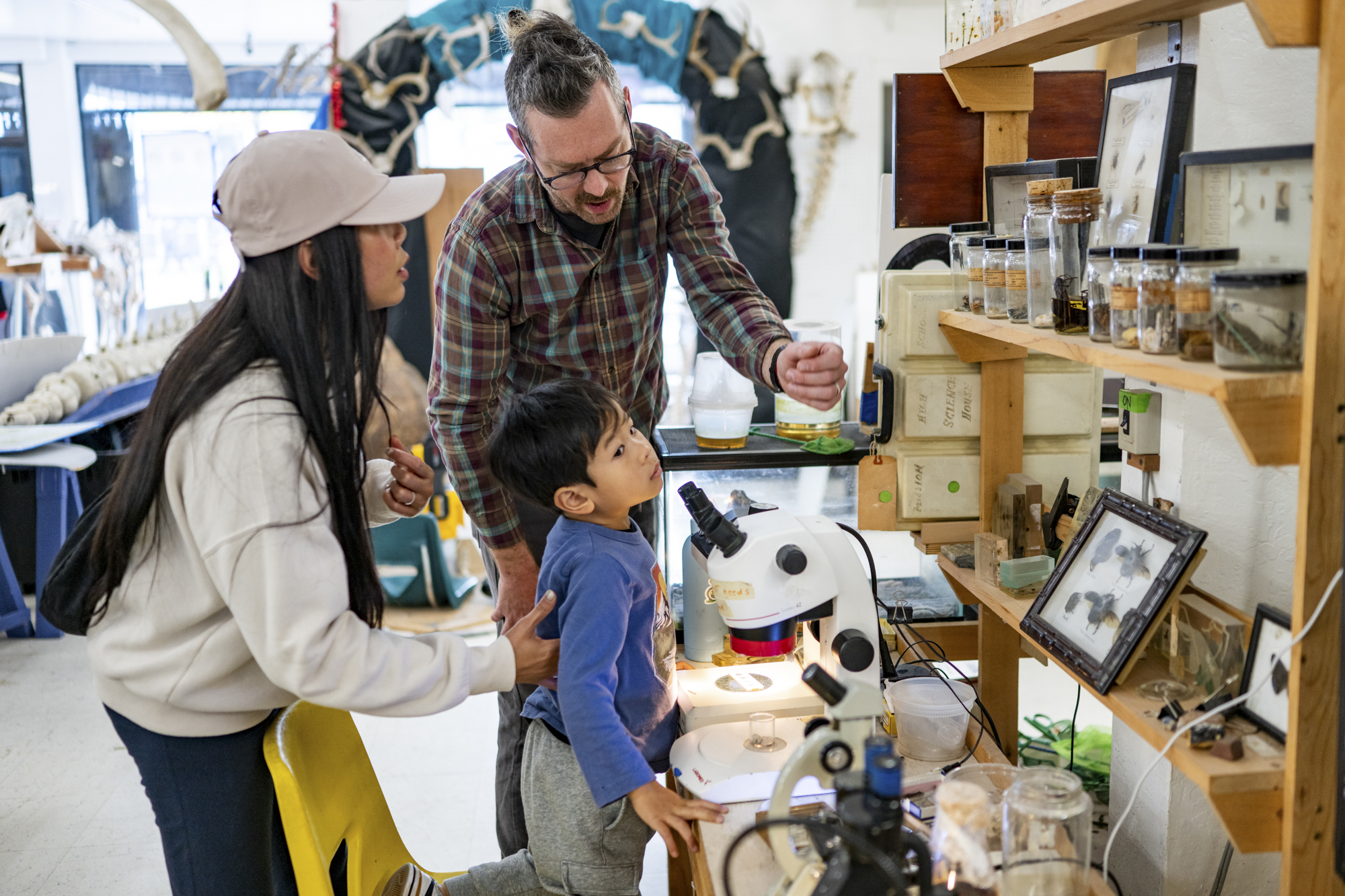 Bart Evans, programs manager and science instructor, talks with students and parents at Mission Science Workshop in the Excelsior neighborhood of San Francisco on Feb. 9, 2026, during an SFUSD teachers’ strike that closed all district schools. (Beth LaBerge/KQED)
