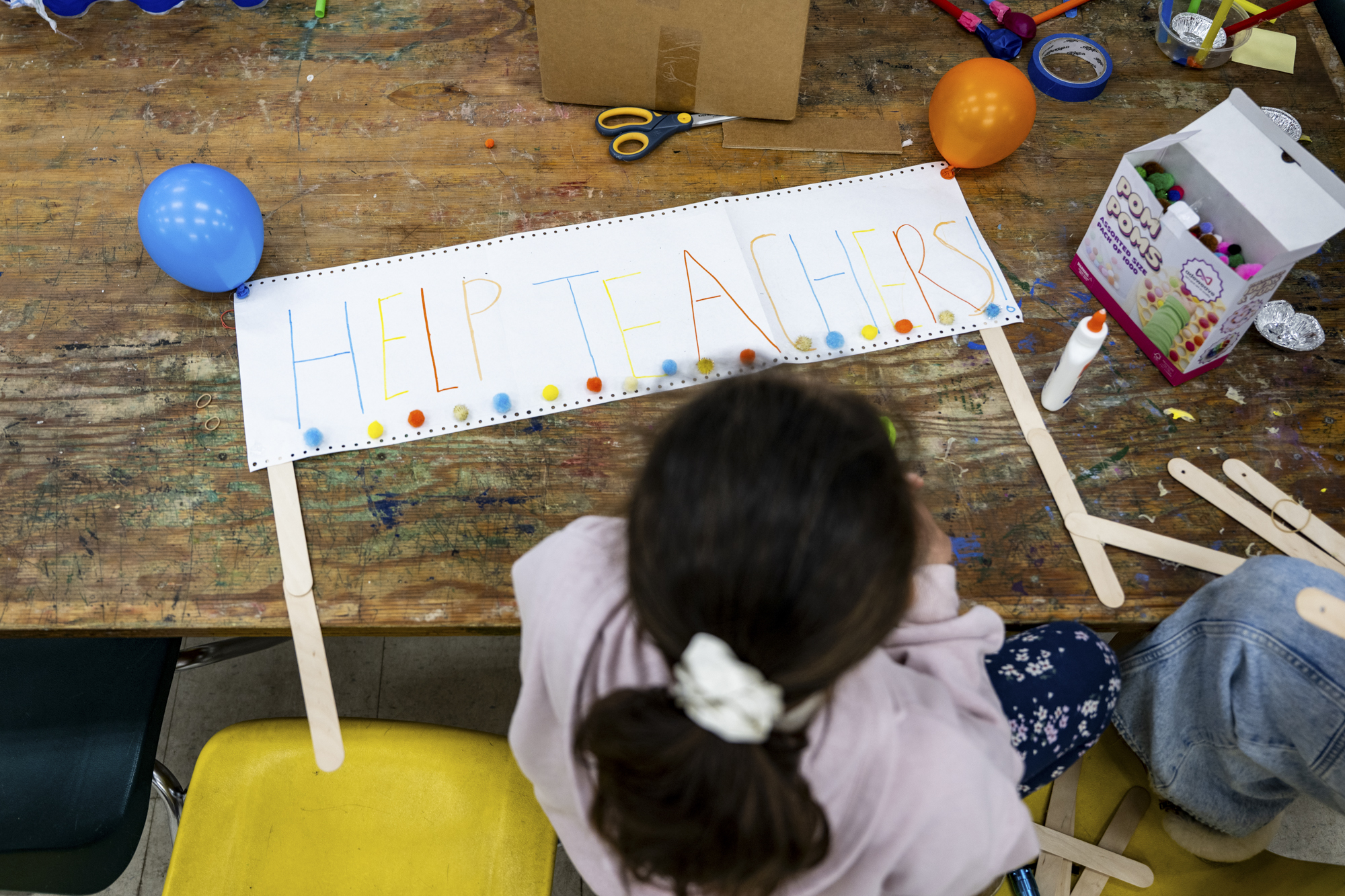 Students make a sign that says, "Help Teachers" at Mission Science Workshop in the Excelsior neighborhood of San Francisco on Feb. 9, 2026, during an SFUSD teachers’ strike that closed all district schools. (Beth LaBerge/KQED)