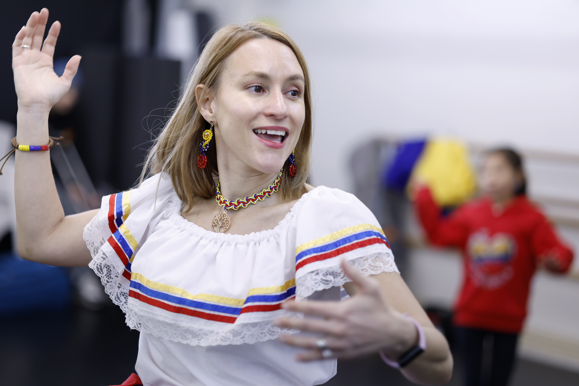 Michelle Paulin dances while instructing youth at the Dulce Tricolor Venezolano dance group at the Ariel Dance Studio in Campbell on Jan. 25, 2026. Dulce Tricolor, a Bay Area Venezuelan dance group founded in 2019, teaches children traditional folk dances while preserving culture, building community and offering a sense of home amid Venezuela’s ongoing political and economic crisis. (Josie Lepe for KQED)