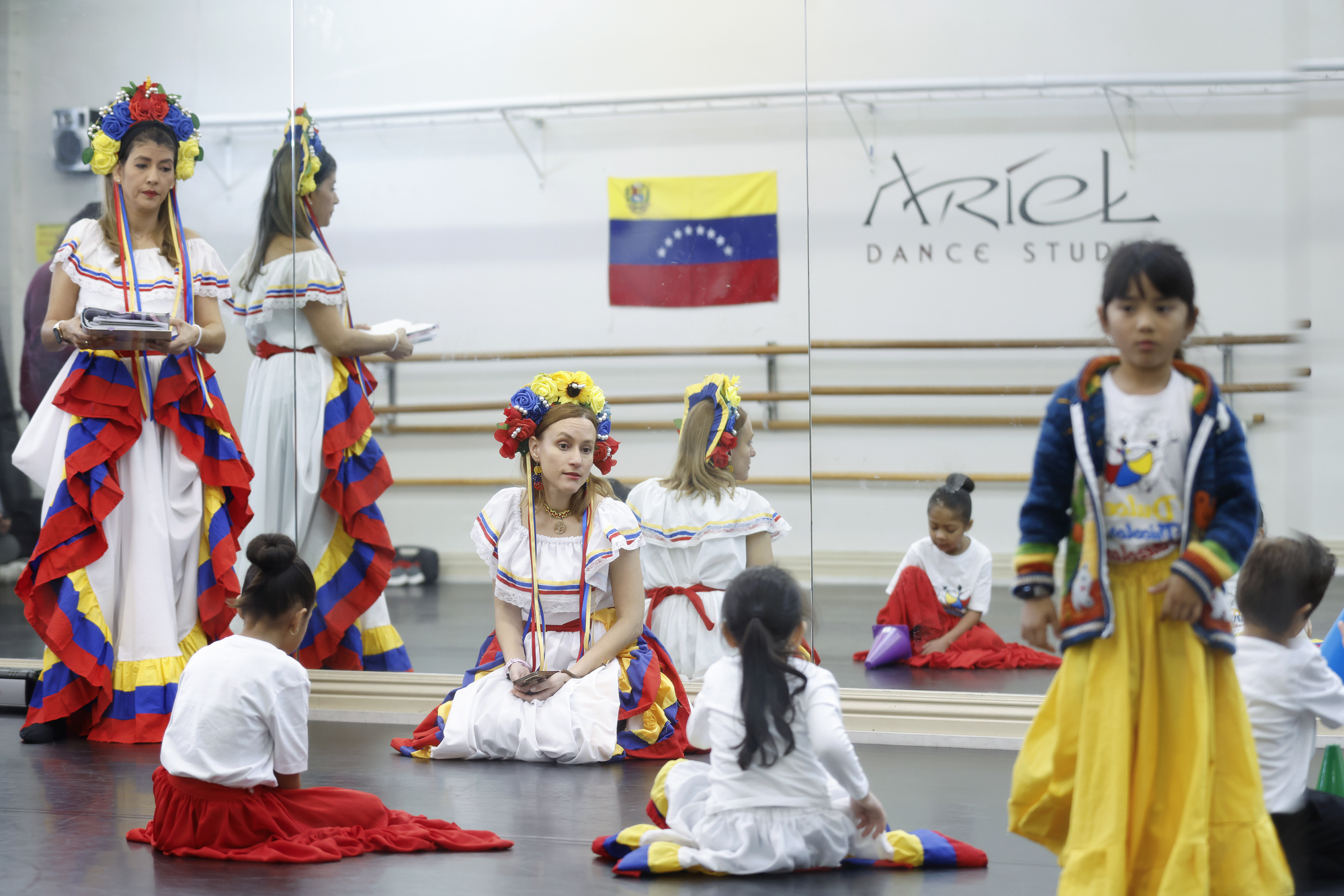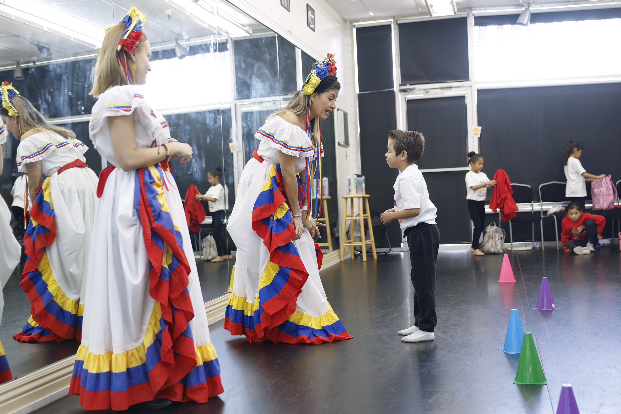 Carolina Meneses (center) speaks with Zeus Hernandez, 5, during morning lessons at the Dulce Tricolor Venezolano dance group at the Ariel Dance Studio in Campbell on Jan. 25, 2026. (Josie Lepe for KQED)