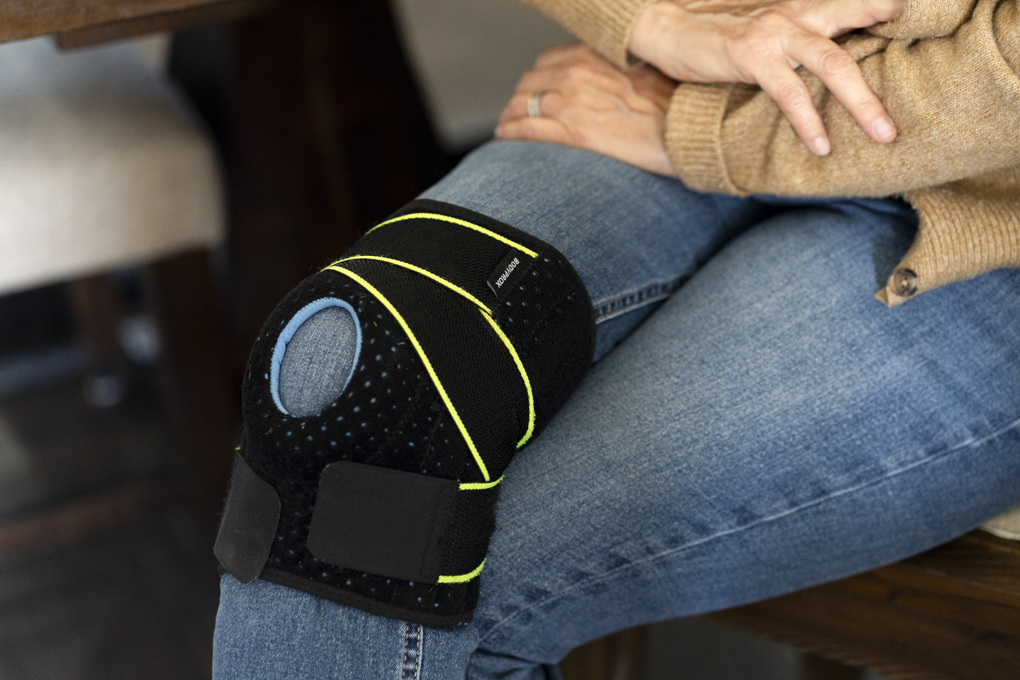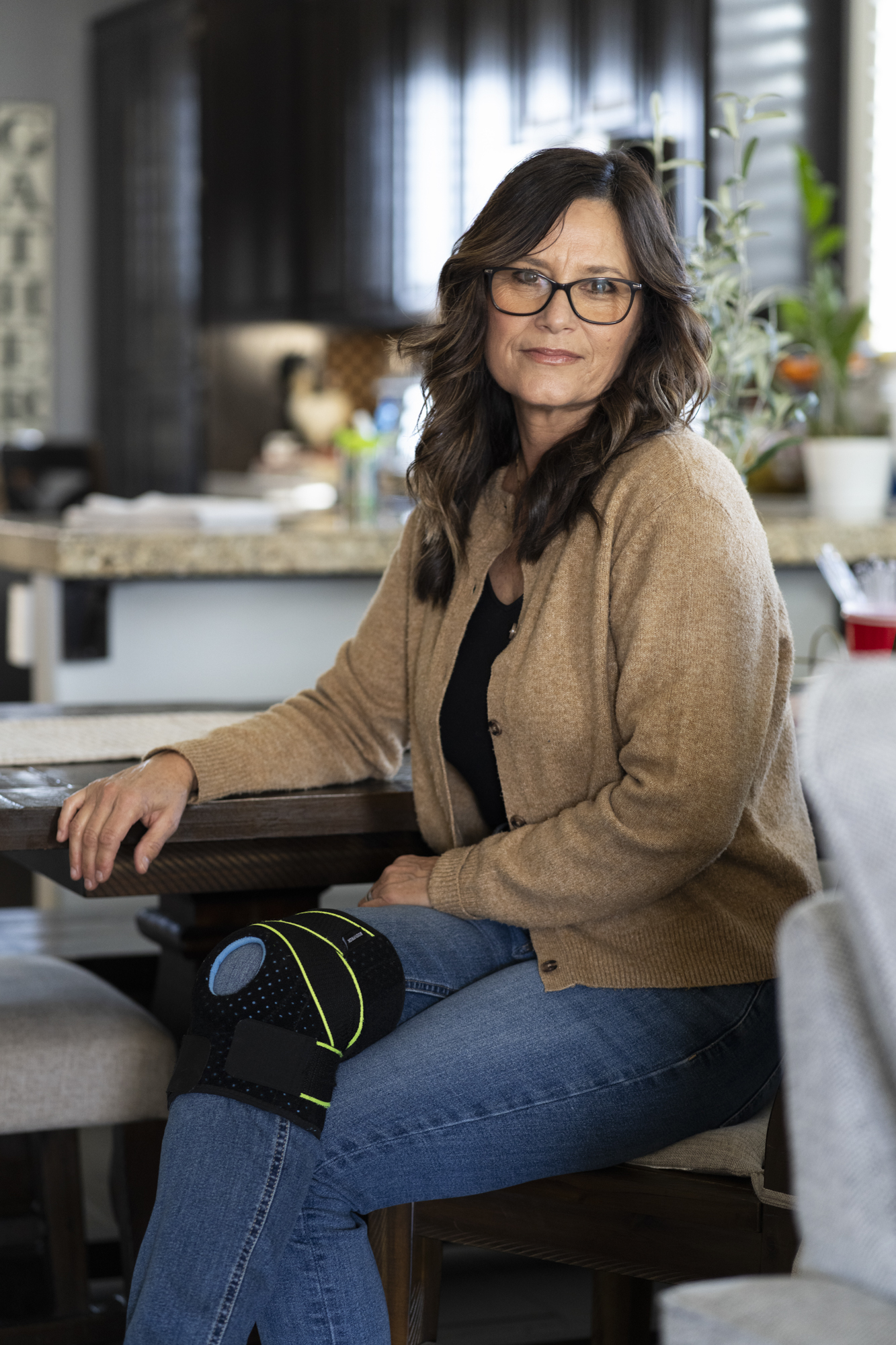 Carrie Esqueda wears a knee brace at home in Wildomar on Feb. 9, 2026. (Lauren Justice for KQED)