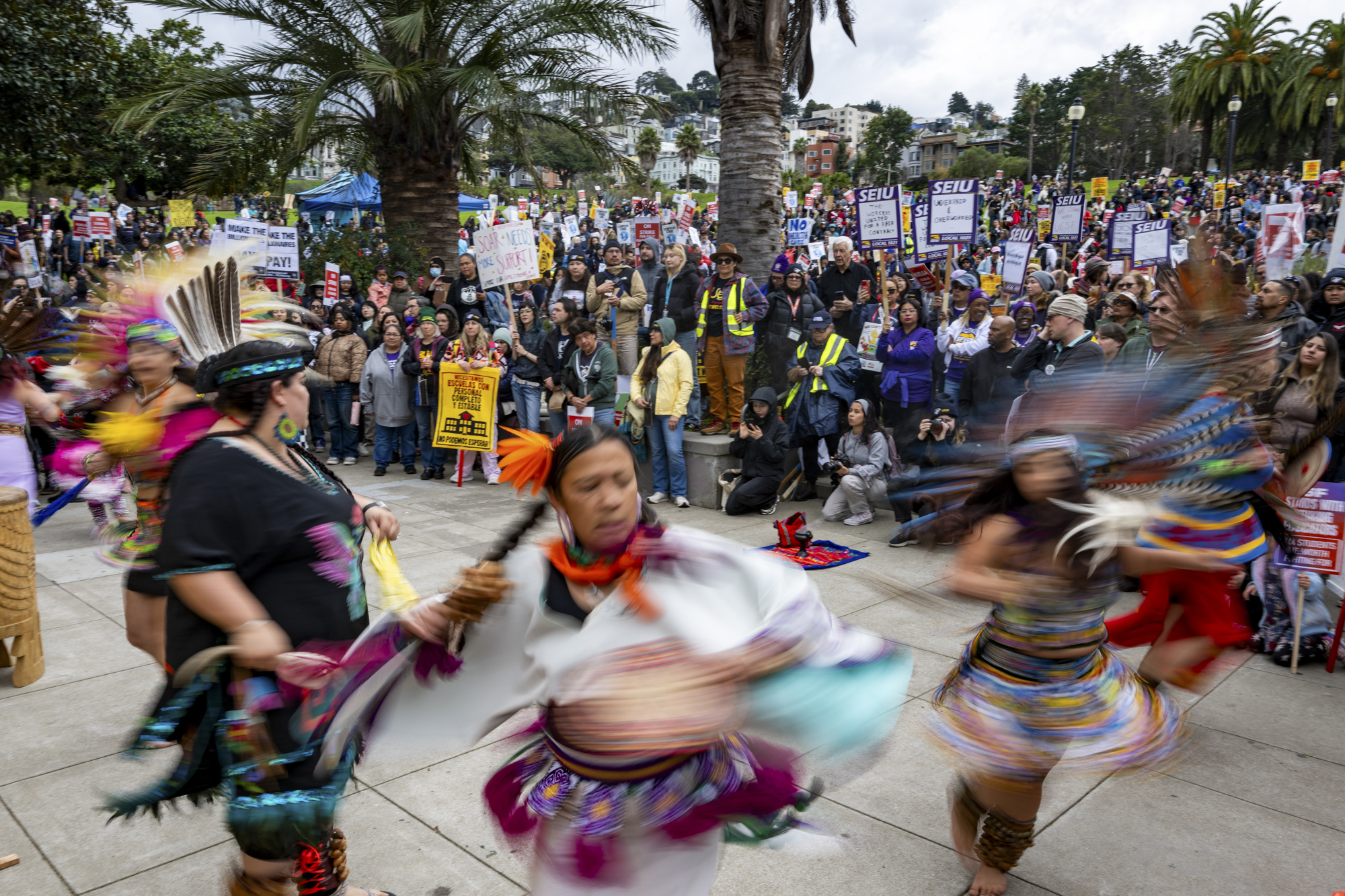 Aztec dancers perform during a rally of teachers, faculty, and supporters on the second day of an SFUSD teachers’ strike at Dolores Park in San Francisco on Feb. 10, 2026. (Beth LaBerge/KQED)