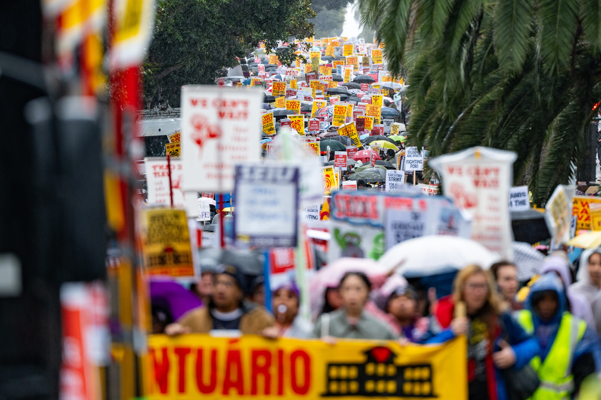 “Not enough. We walk the line until it’s 100%,” Nathalie Hrizi, United Educators of San Francisco’s vice president of substitutes, said to loud cheers from the crowd of thousands gathered at a rainy rally at Dolores Park. “We walk the line until special education has a workload model. We walk the line until paraeducators and certificated staff get the raise we deserve to stay in our city.”