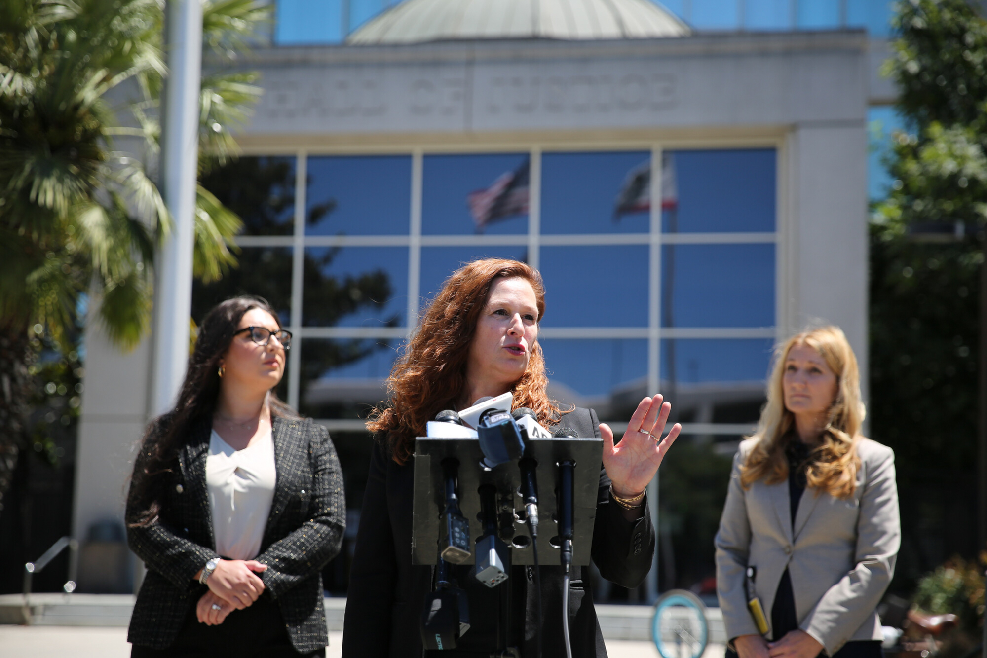 Santa Clara County Assistant District Attorney Angela Bernhard speaks during a press conference following an arraignment hearing for Richard Tillman at the Hall of Justice in San José on July 23, 2025. (Jospeh Geha/KQED)