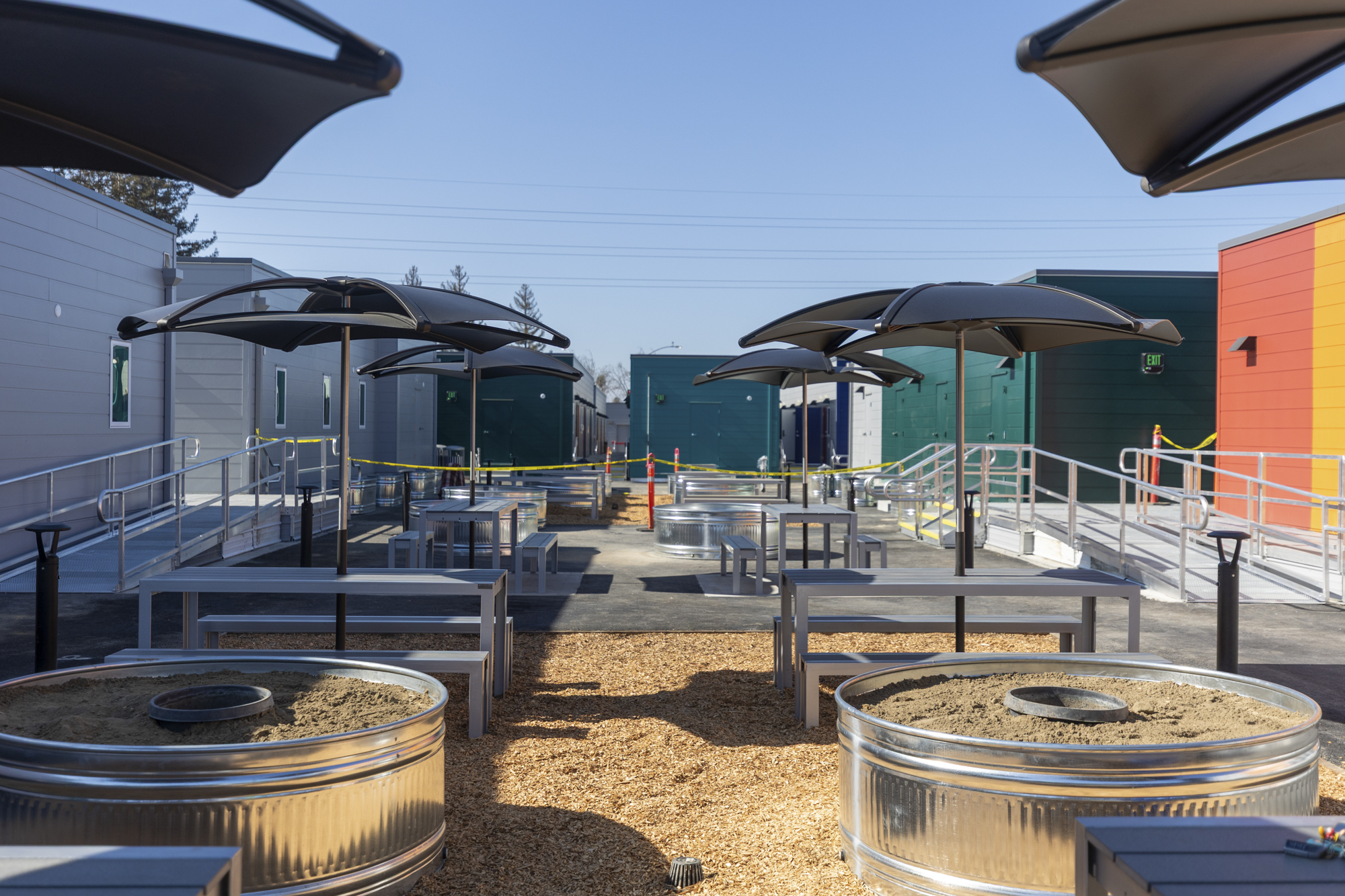 Outdoor common areas and walkways are shown at the Cerone Interim Housing Community on Feb. 5, 2026, in San José. The site will include shared seating, shaded areas and support facilities for future residents. (Gustavo Hernandez/KQED)