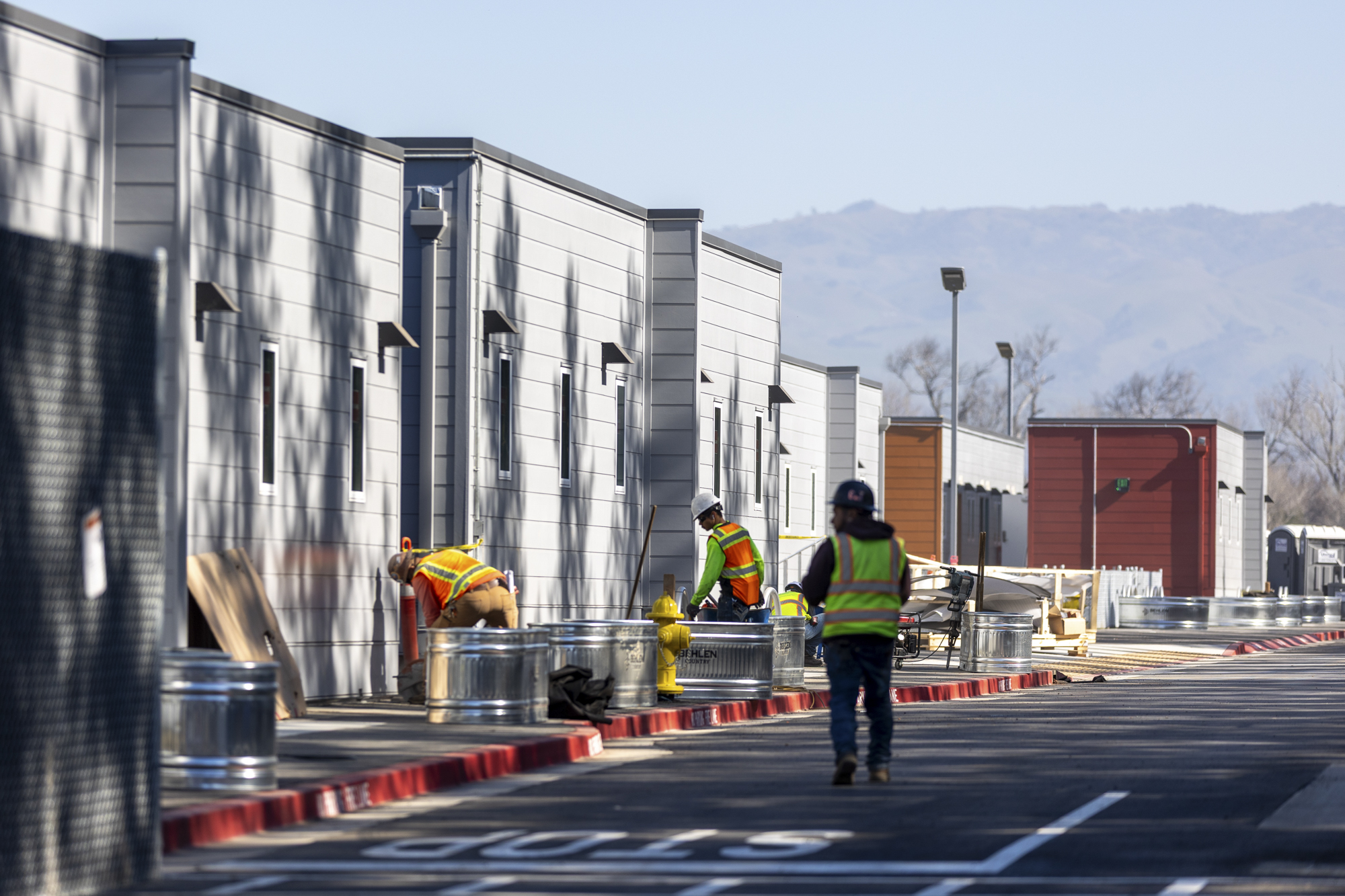 Construction workers continue building units at the Cerone Interim Housing Community on Feb. 5, 2026, in San José. The interim housing site is expected to house up to 200 people. (Gustavo Hernandez/KQED)
