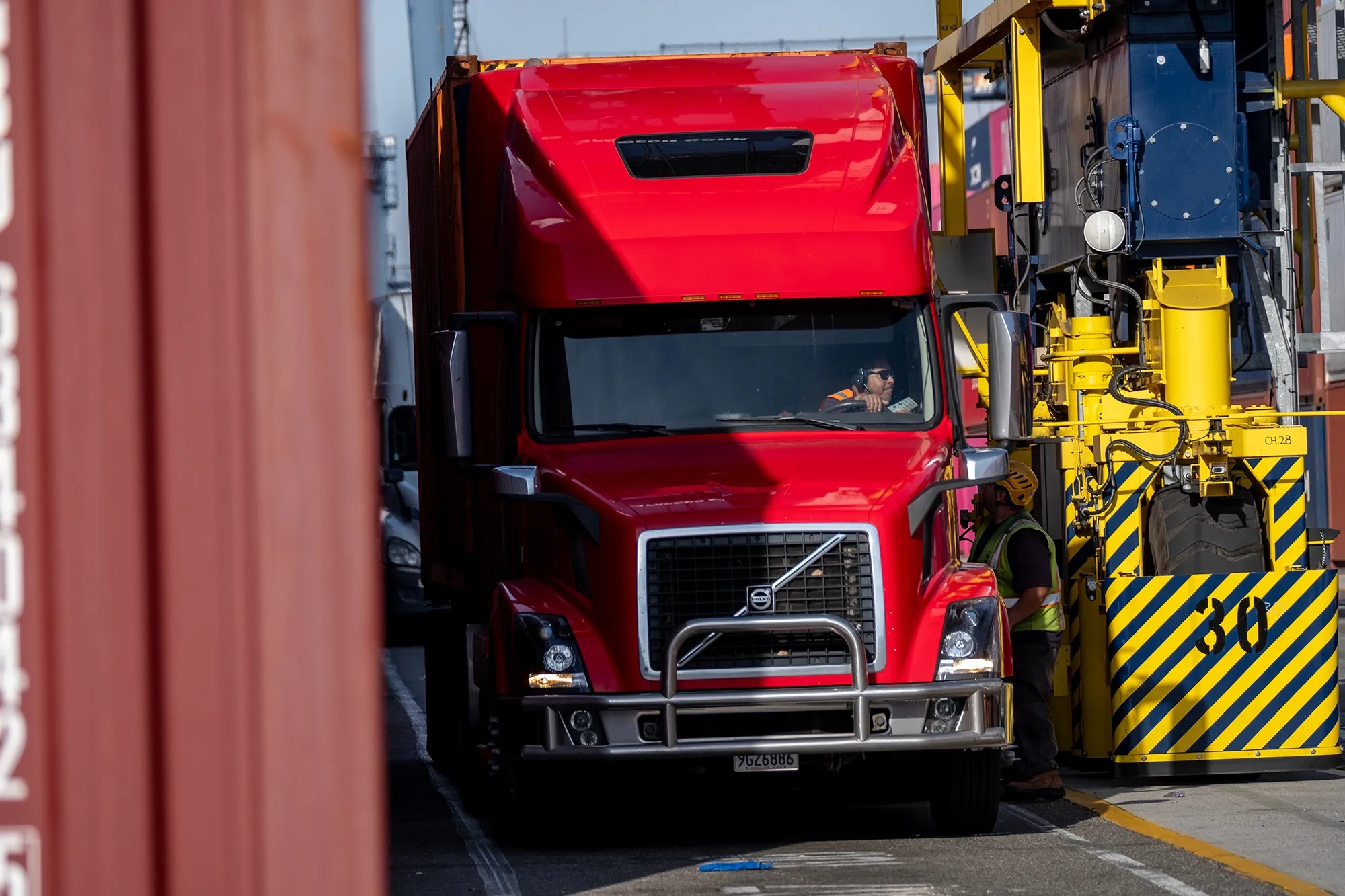 A truck driver prepares to leave after receiving a shipping container at Yusen Terminals at the Port of Los Angeles in San Pedro on Feb. 11, 2025. (Joel Angel Juarez for CalMatters)