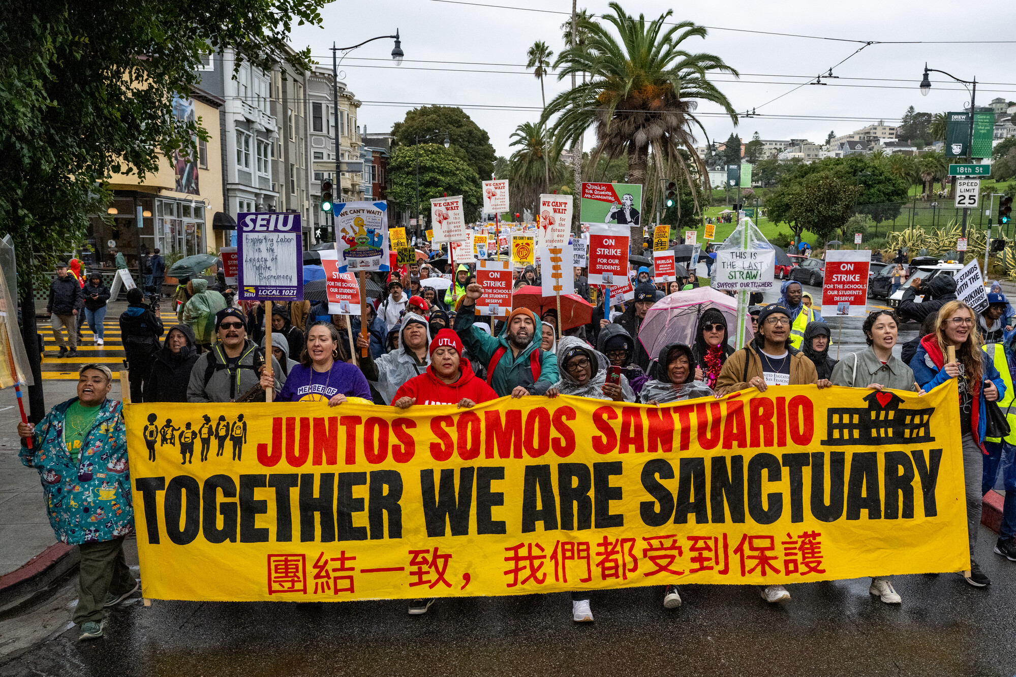 Teachers, faculty and supporters march from Dolores Park to City Hall during the second day of an SFUSD teachers strike in San Francisco on Feb. 10, 2026. (Beth LaBerge/KQED)