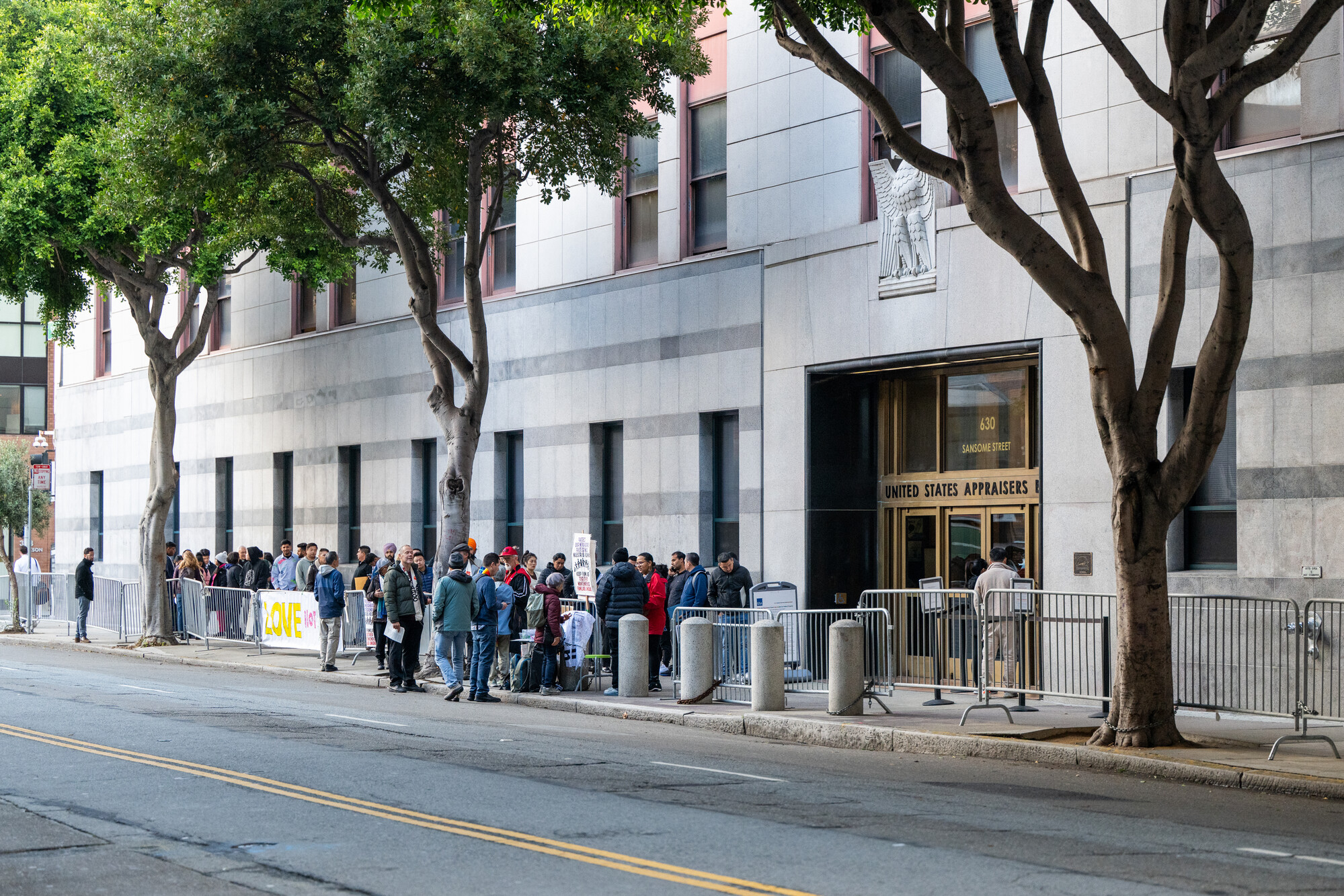 People line up outside the ICE Field Office in downtown San Francisco on Oct. 14, 2025, for scheduled check-ins and immigration-related appointments. (Beth LaBerge)
