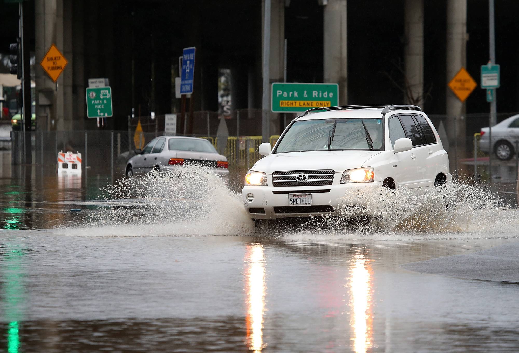 A motorist drives through a flooded intersection on Dec. 3, 2014, in Mill Valley, California. (Justin Sullivan/Getty Images)