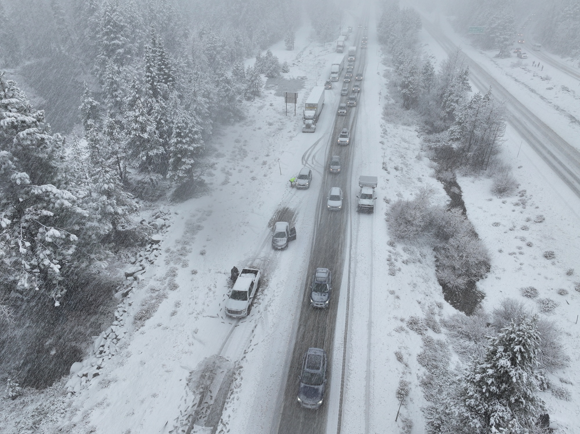 A view of trucks piled up during heavy snow near Donner Pass in Truckee, California, on Dec. 24, 2025. A major storm system passing throughout Northern California is bringing significant disruptions to travel, including what officials called the worst conditions over Donner Pass in years. (Tayfun Coskun/Anadolu via Getty Images)