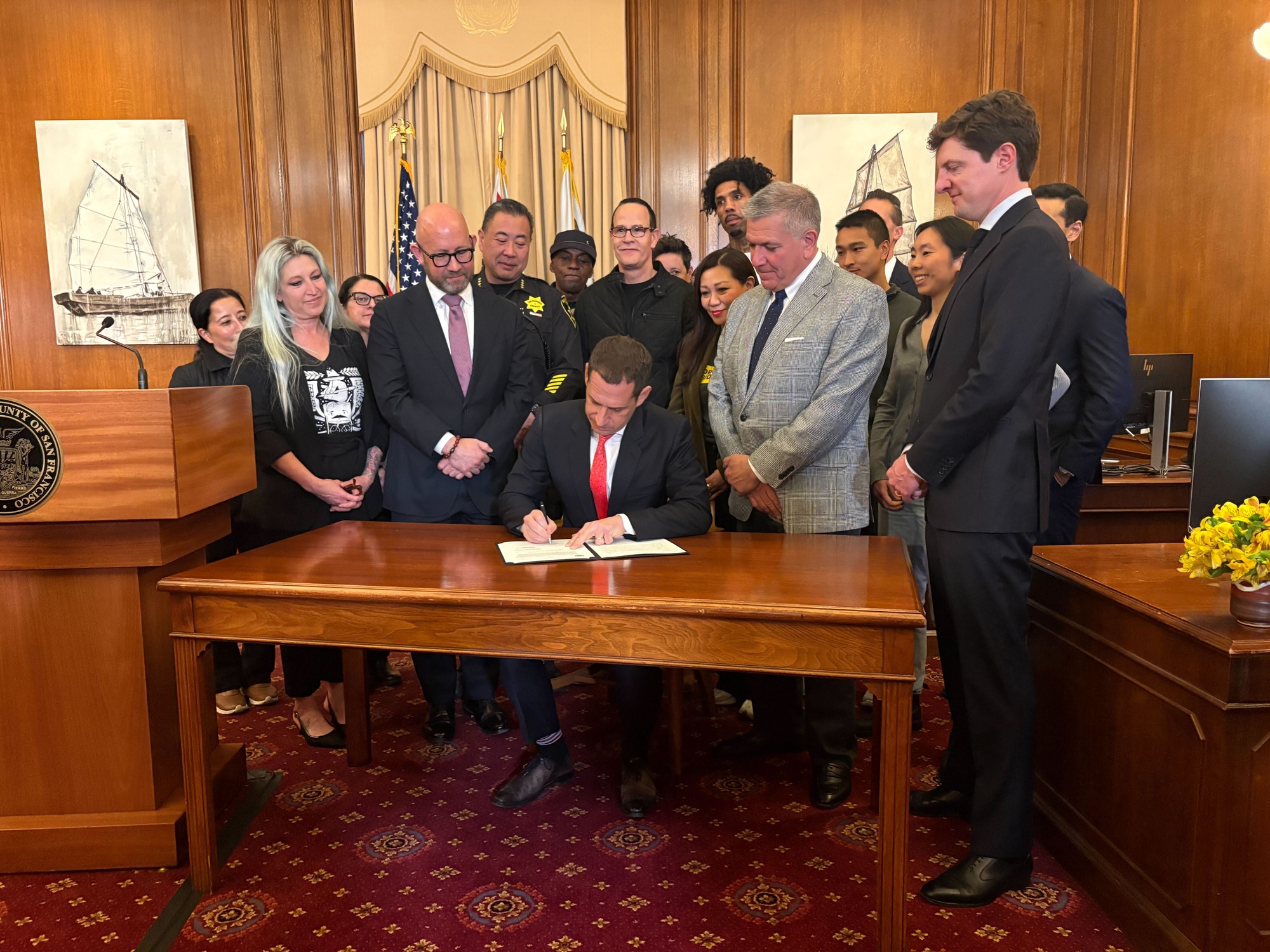 San Francisco Mayor Daniel Lurie signs legislation on Feb. 17, 2026, allowing the city to open a new facility as an alternative to jail for people who are publicly intoxicated. (Sydney Johnson/KQED)