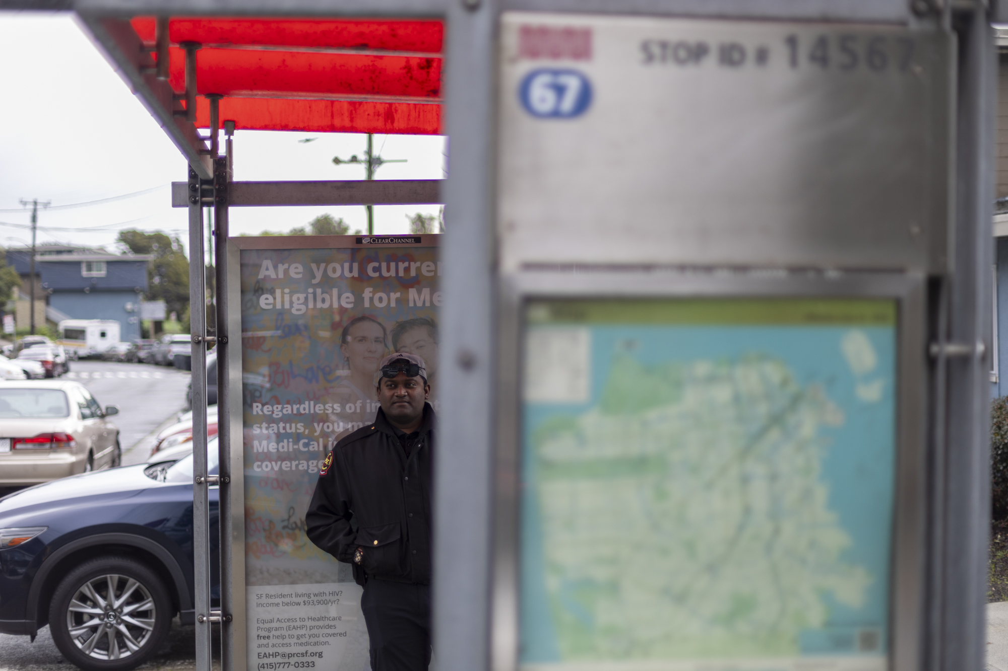 Mano Ram, a Belmont resident, stands beneath a 67 Bernal Heights bus shelter near the Alemany Apartments in Bernal Heights, San Francisco, on Feb. 18, 2026. Ram commutes by transit from Belmont to his job as a security guard at the Alemany Apartments. (Gustavo Hernandez/KQED)