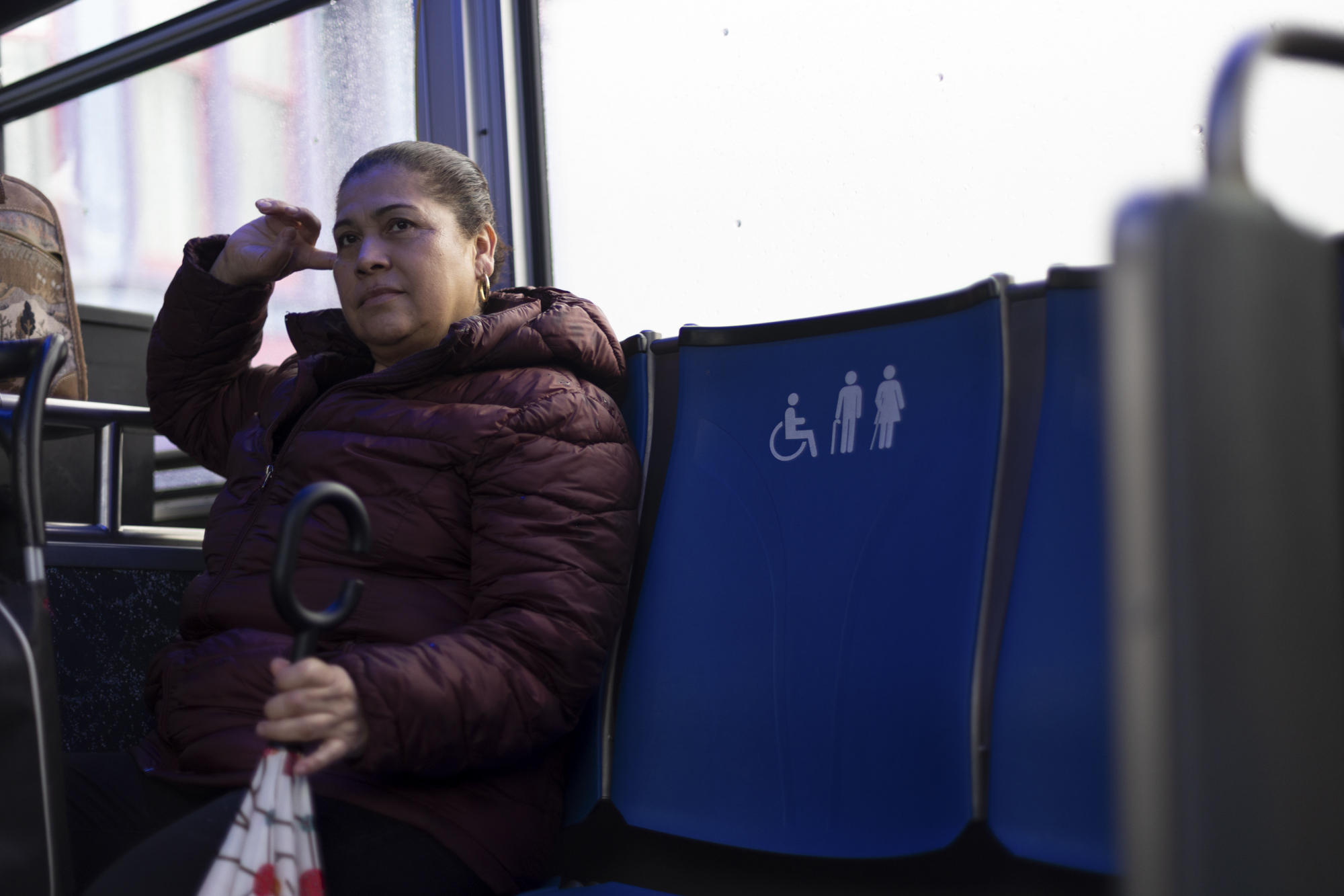 Maria Castillo rides aboard the 67 Bernal Heights bus in San Francisco on Feb. 18, 2026. (Gustavo Hernandez/KQED)