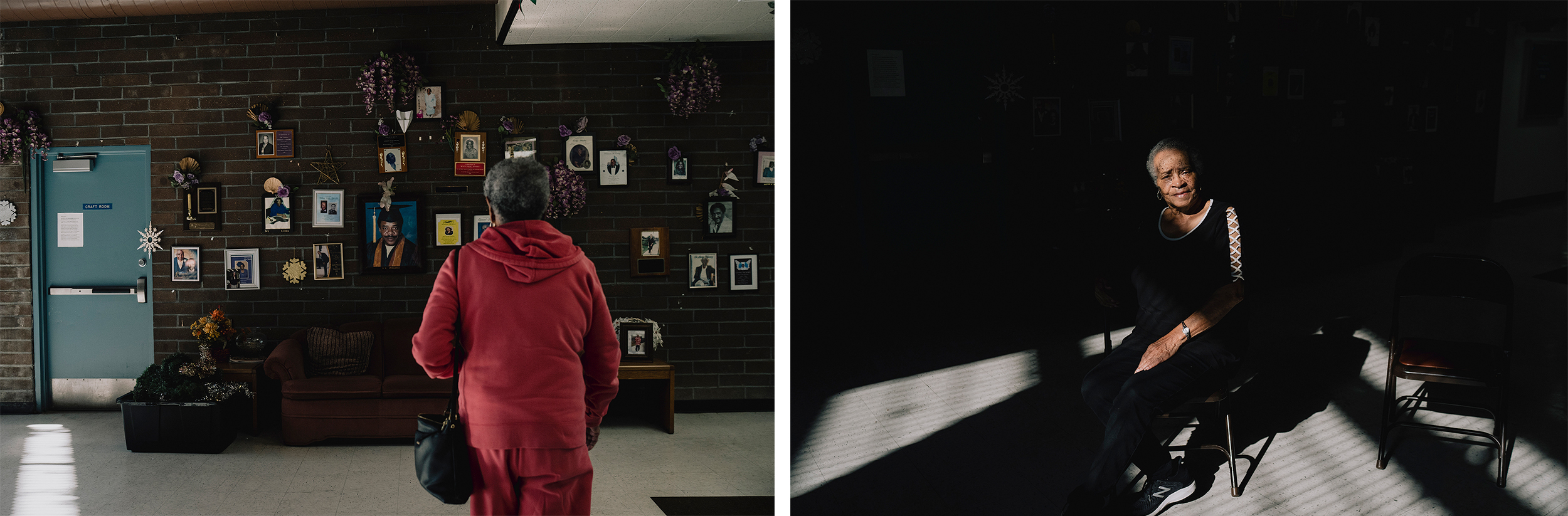 Left: A memorial wall honoring past members at the Watts Senior Center in Los Angeles. Right: Almeter Carroll, 87, sits at the Watts Senior Center in Los Angeles. “I like coming here, I like getting together with the group and playing cards,” said Ms. Carroll. “People come for fellowship. To talk.” She added, “The pandemic did a lot to this place and to my church.” (Isadora Kosofsky for CatchLight/CalMatters)