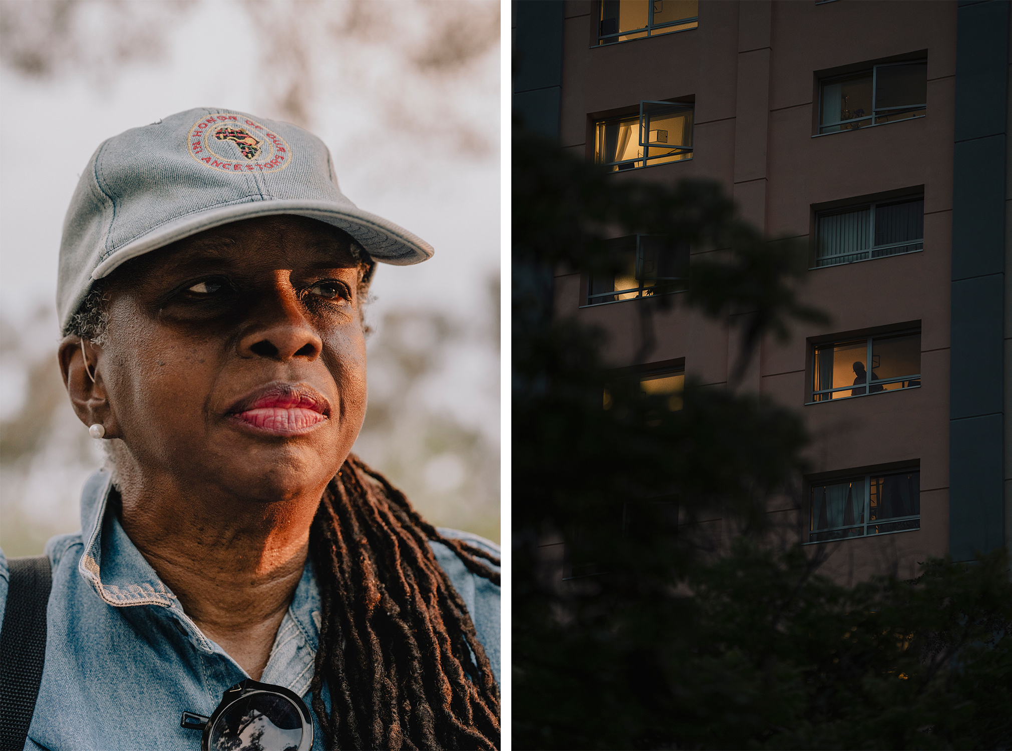 Left: Beverlee Kelly, 70, spends time at Kenneth Hahn State Recreation Area in Los Angeles. Ms. Kelly used to be active at a senior center near her home before the pandemic. She has not returned since the shutdown in 2020 due to health concerns, as she is unvaccinated. Right: Shane Shabad, 90, stands in his apartment in Santa Monica. (Isadora Kosofsky for CalMatters/CatchLight)