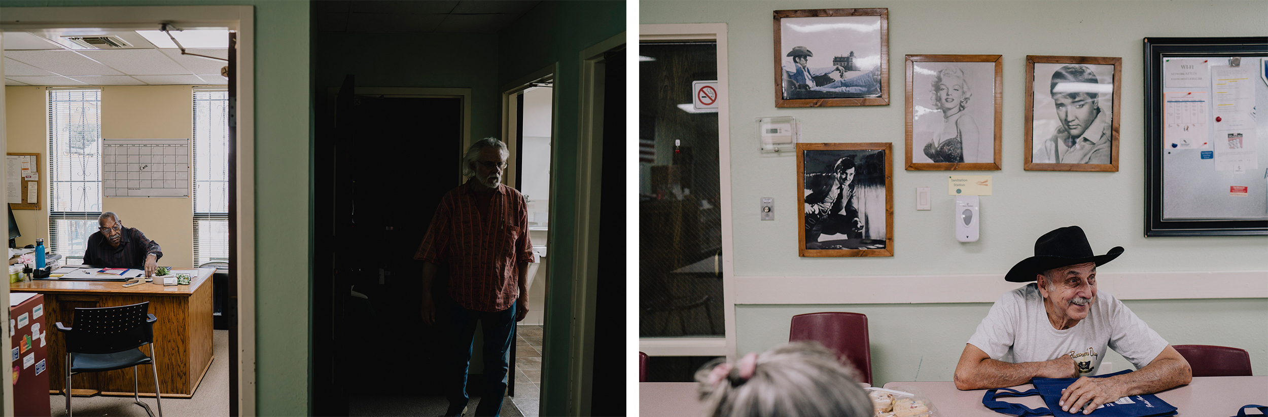 Left: Lewis Brown, 80, Director, sits in his office at the Tehachapi Senior Center. Right: Tony Kotch, 86, sits at a table for lunch at the Tehachapi Senior Center. The Tehachapi Senior Center is volunteer-run, and the older adults cover costs through donations. Older adults residing in rural areas are at an increased risk of social isolation. (Isadora Kosofsky for CalMatters/CatchLight)
