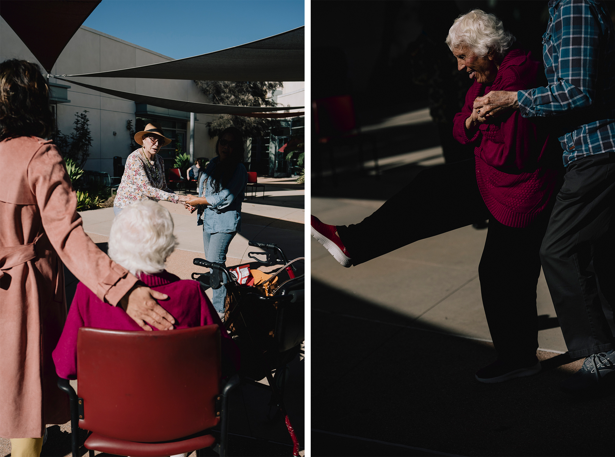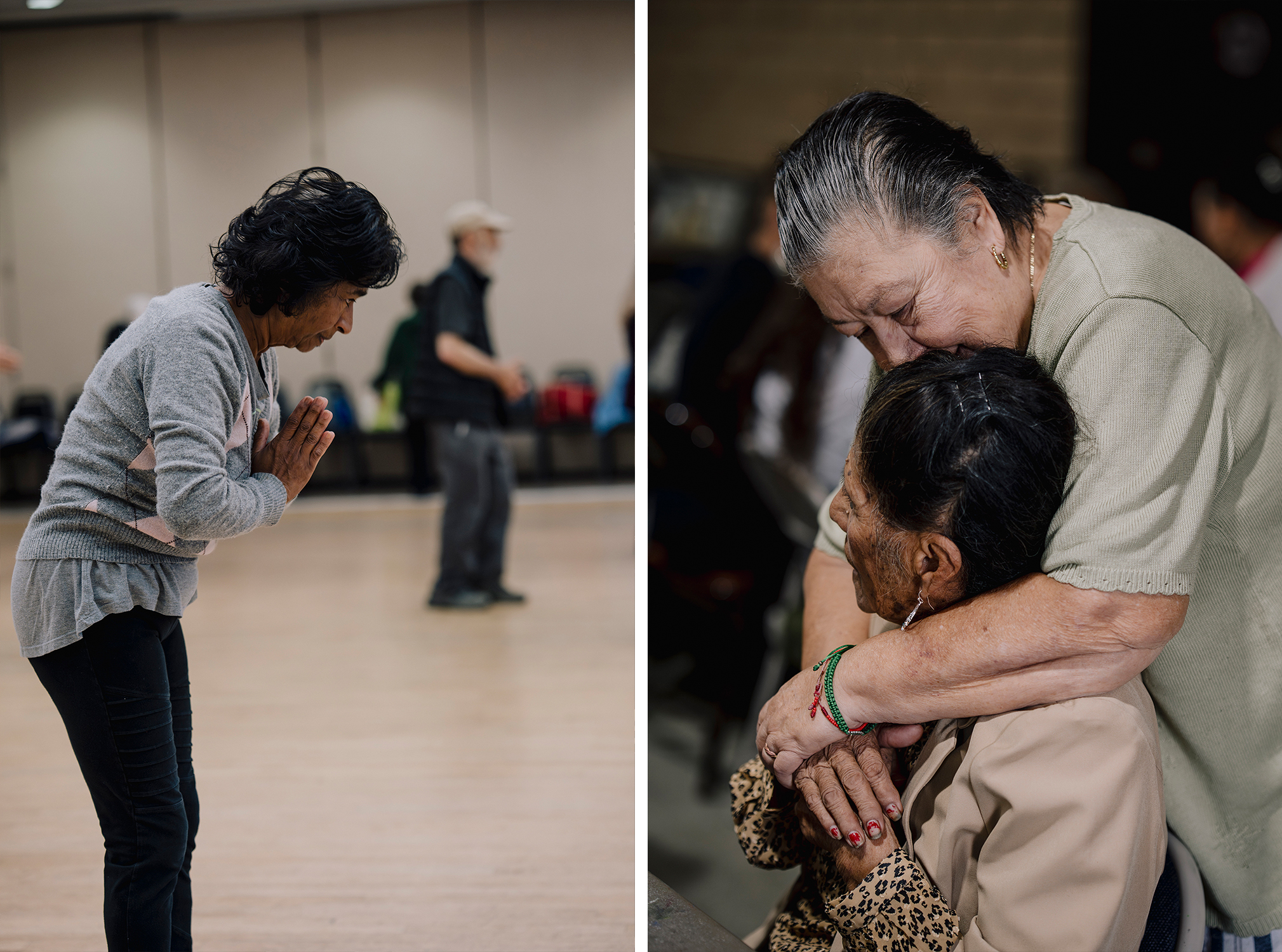 Left: Cristina Guevara, 78, embraces Julia Sedana, 82, at the Lincoln Heights Senior Center. Right: Selvee Provost, 67, bows during a Tai-Chi class at the Culver City Senior Center. (Isadora Kosofsky for CalMatters/CatchLight)