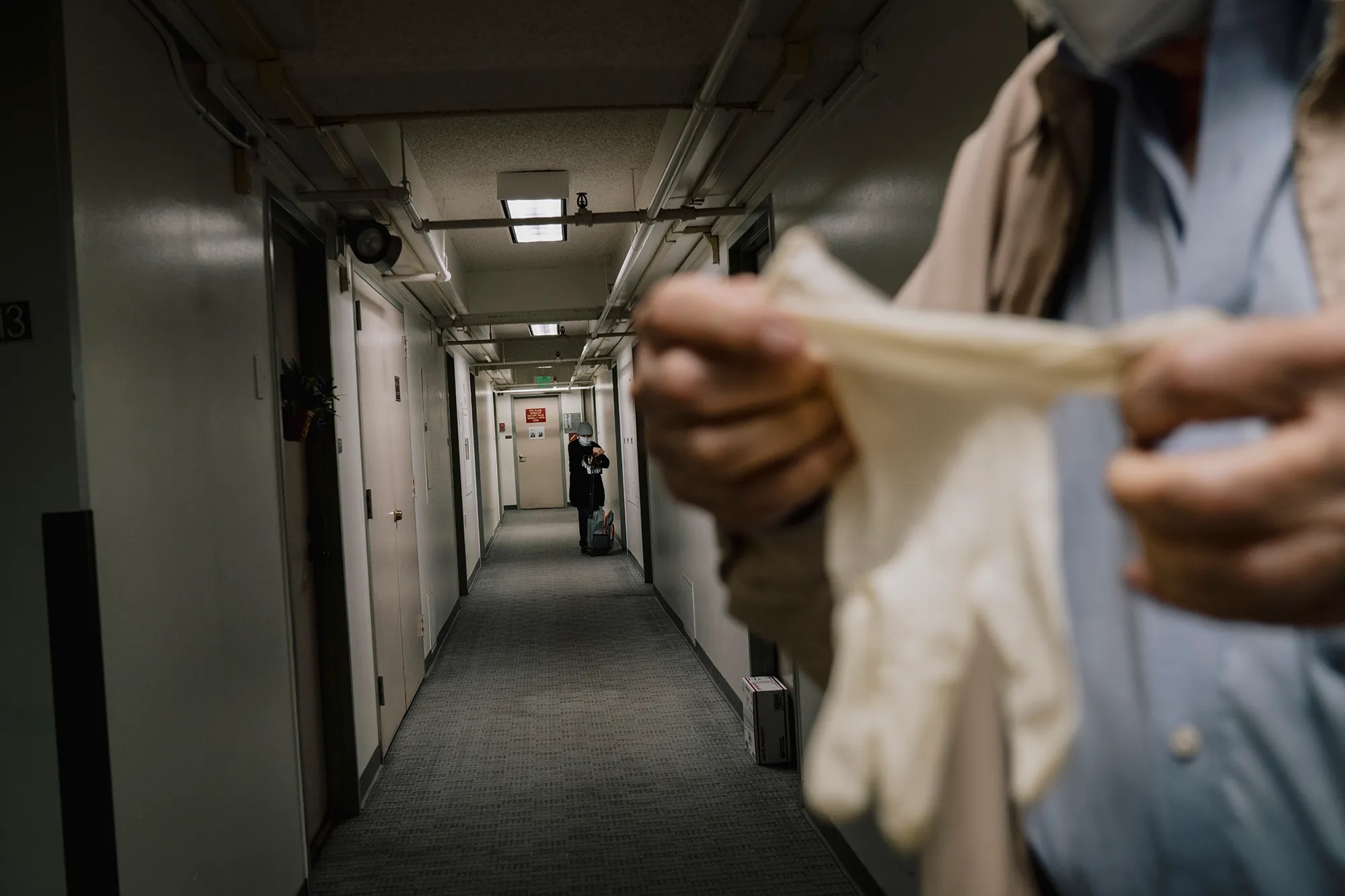 Residents of an affordable senior housing complex in Santa Monica stand in a hallway in 2020. (Isadora Kosofsky for CalMatters/CatchLight)