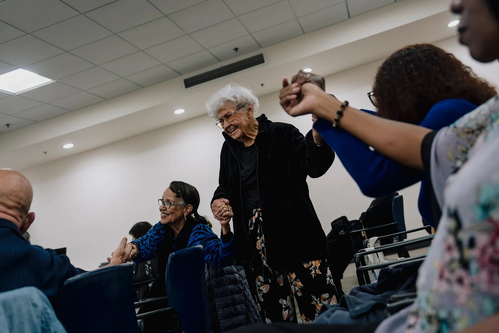 Sharron Robinson, 80, Laura Shroder, 89, and Johnnie Devereaux, 86, hold hands and dance as other members sing karaoke at the Culver City Senior Center. (Isadora Kosofsky for CatchLight/CalMatters)