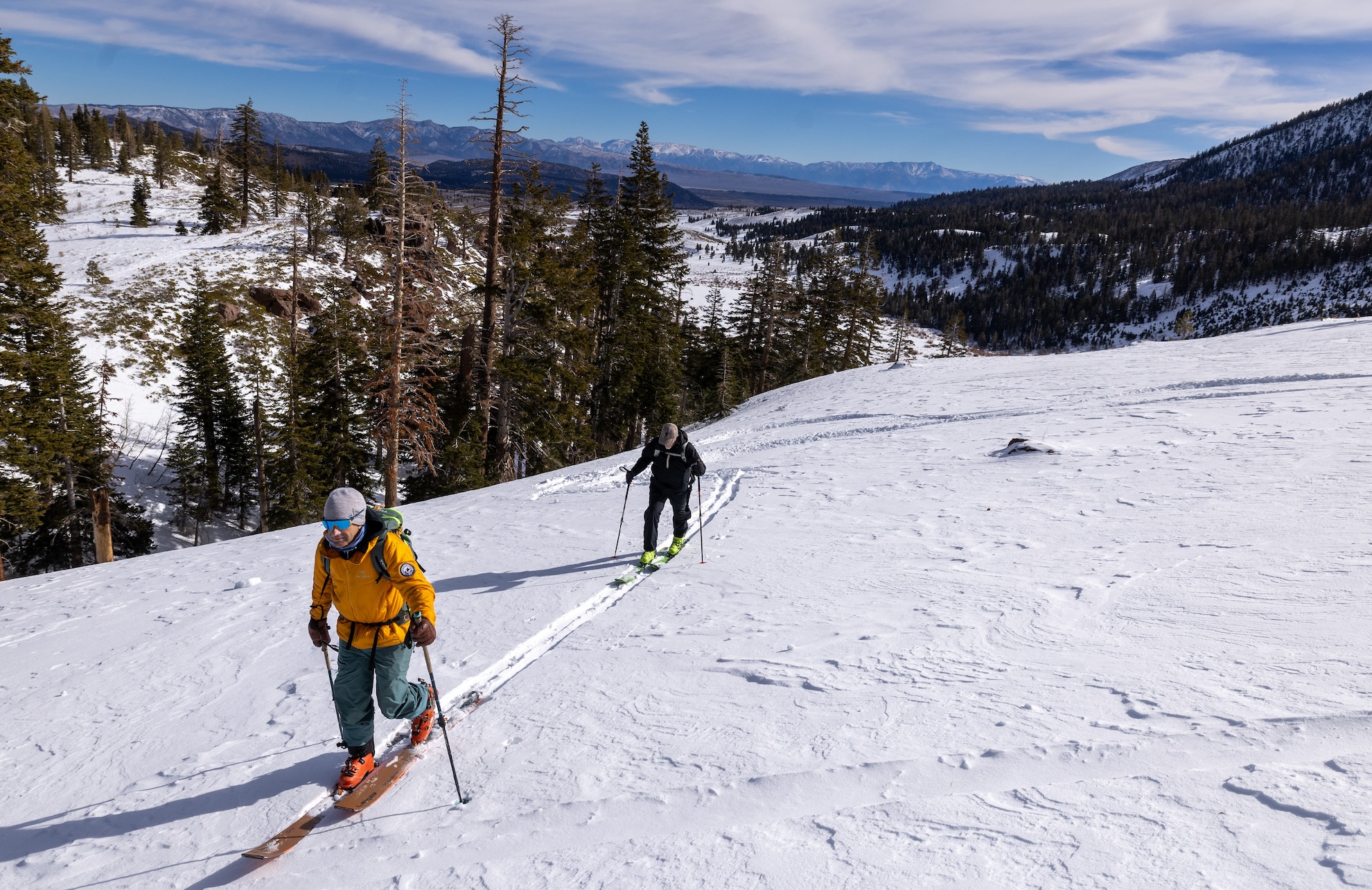 Veteran guide Howie Schwartz, left, leads Los Angeles Times reporter Jack Dolan, right, into the popular backcountry near the Mill City site to explore the growing trend of backcountry skiing on Wednesday, Feb. 12, 2025 in Mammoth Lakes, CA. Backcountry safety is under scrutiny after this week’s deadly Tahoe avalanche claimed multiple lives. Here’s what experts say about skiing in these remote areas. (Brian van der Brug / Los Angeles Times via Getty Images)
