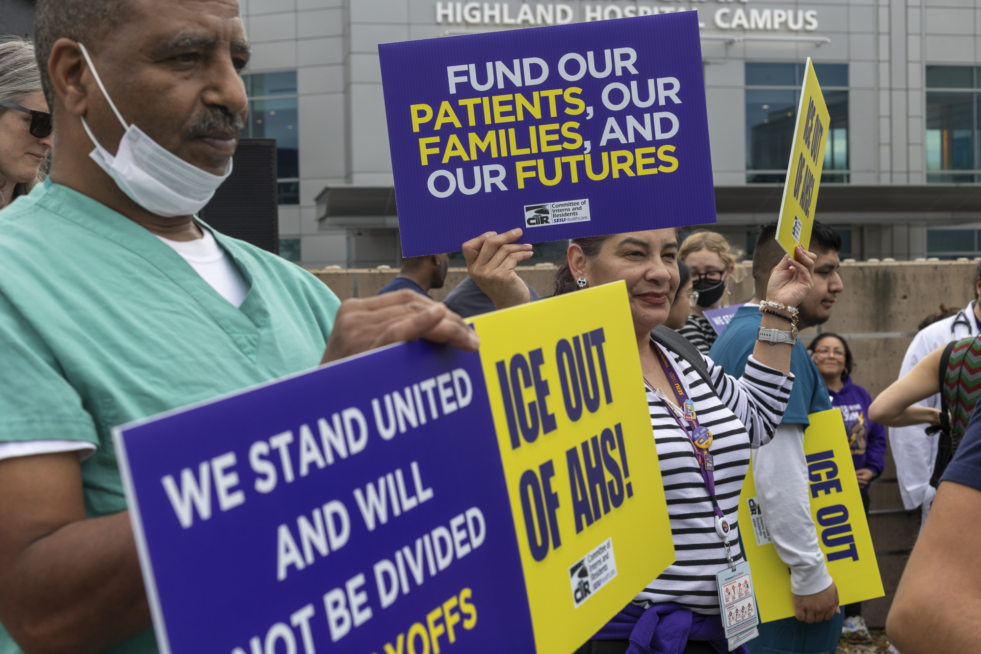 Resident physicians hold signs during a “unity break” outside Highland Hospital in Oakland on Feb. 24, 2026, calling attention to layoffs, staffing shortages and contract negotiations with Alameda Health System, including an ICE protocol. Alameda Health System, the East Bay’s public safety-net hospital system, is proposing about 200 layoffs as executives brace for major reductions in Medicaid revenue. (Gustavo Hernandez/KQED)