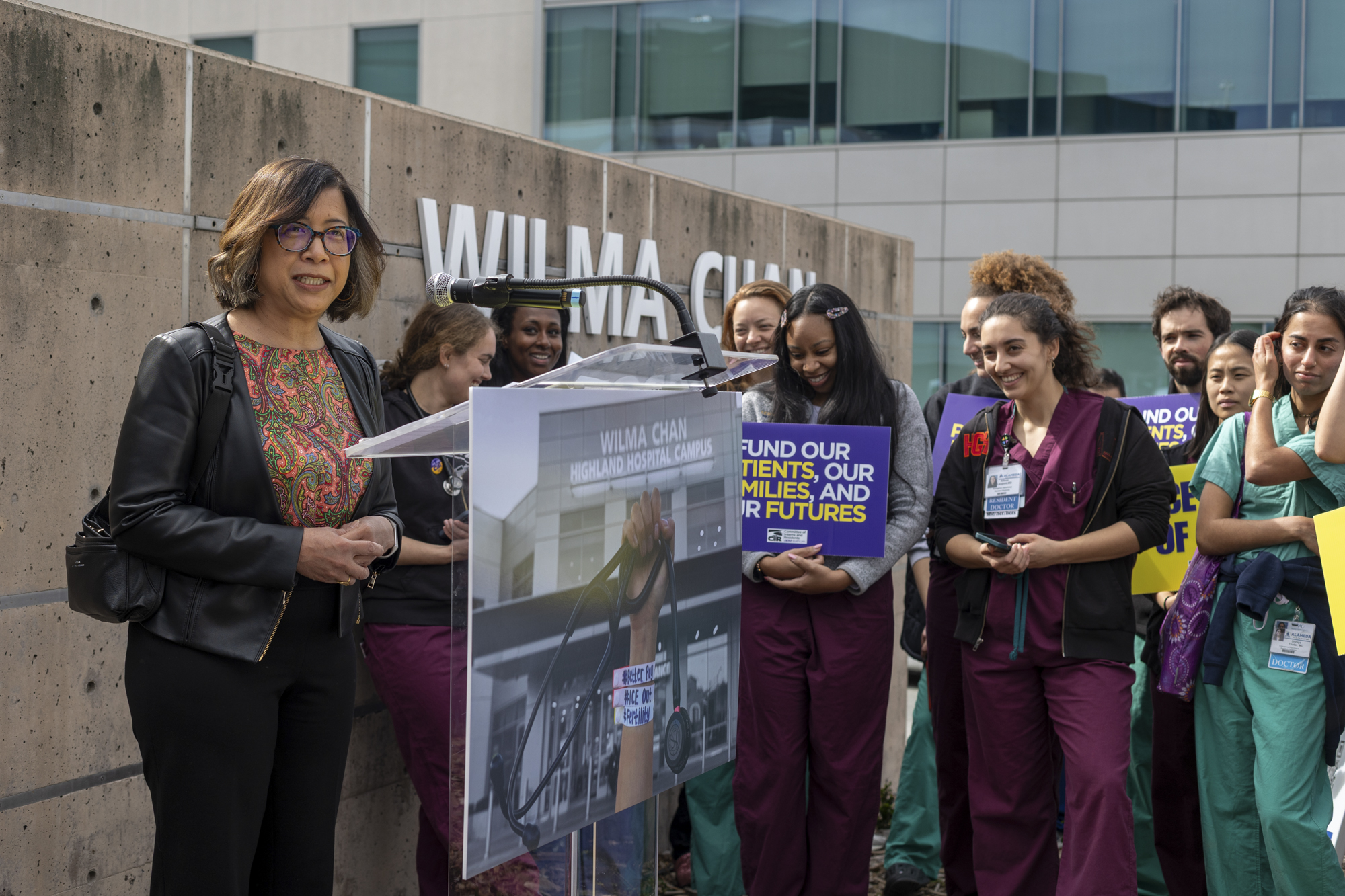 At a rally outside Wilma Chan Highland Hospital Campus in Oakland on Tuesday, Alameda County Supervisor Nate Miley urged health care workers to weigh in at the hearing.