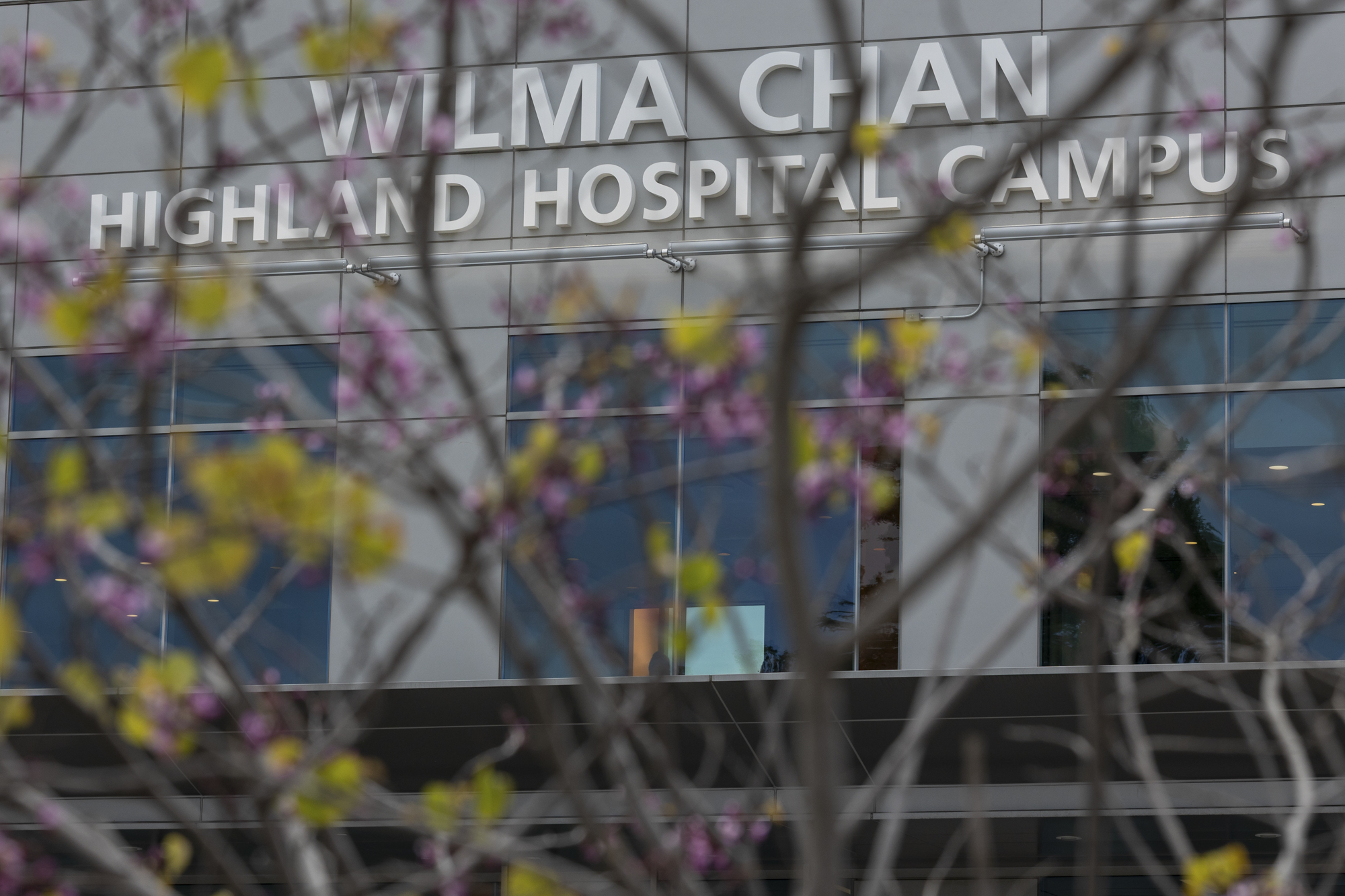 The Wilma Chan Highland Hospital Campus is seen through flowering branches in Oakland on Feb. 24, 2026. The hospital is part of Alameda Health System. (Gustavo Hernandez/KQED)