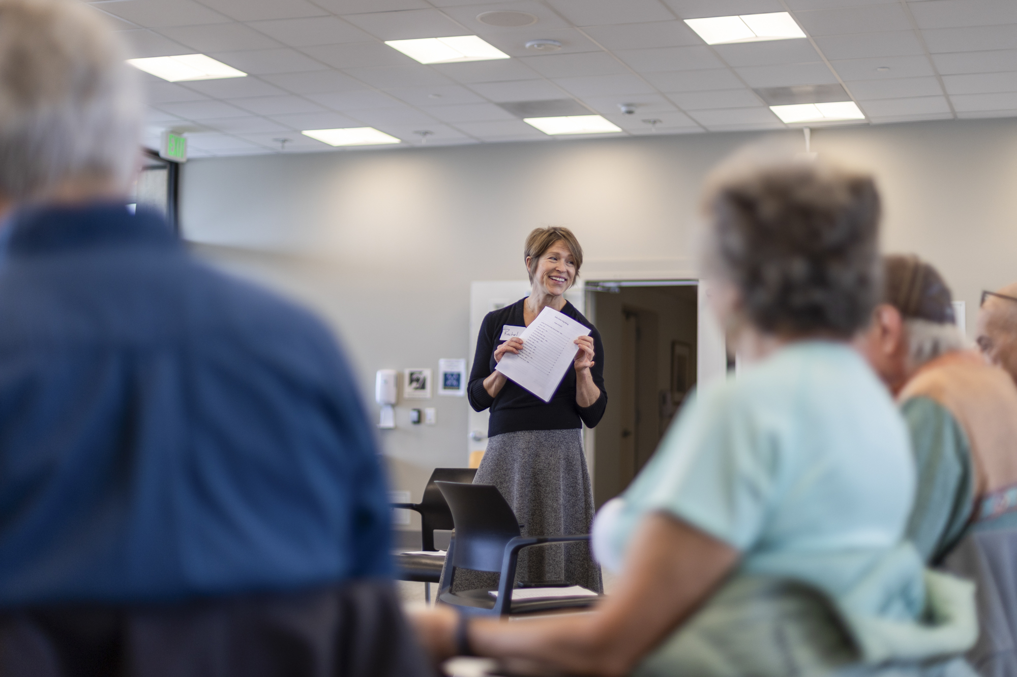 Rachel Main, support services coordinator at Sutter’s Ray Dolby Brain Health Center, holds up a song list during a Music Mends Minds group singing event themed “Songs of the ’60s” at CPMC’s Davies Campus in San Francisco on Jan. 23, 2026 (Gustavo Hernandez/KQED)