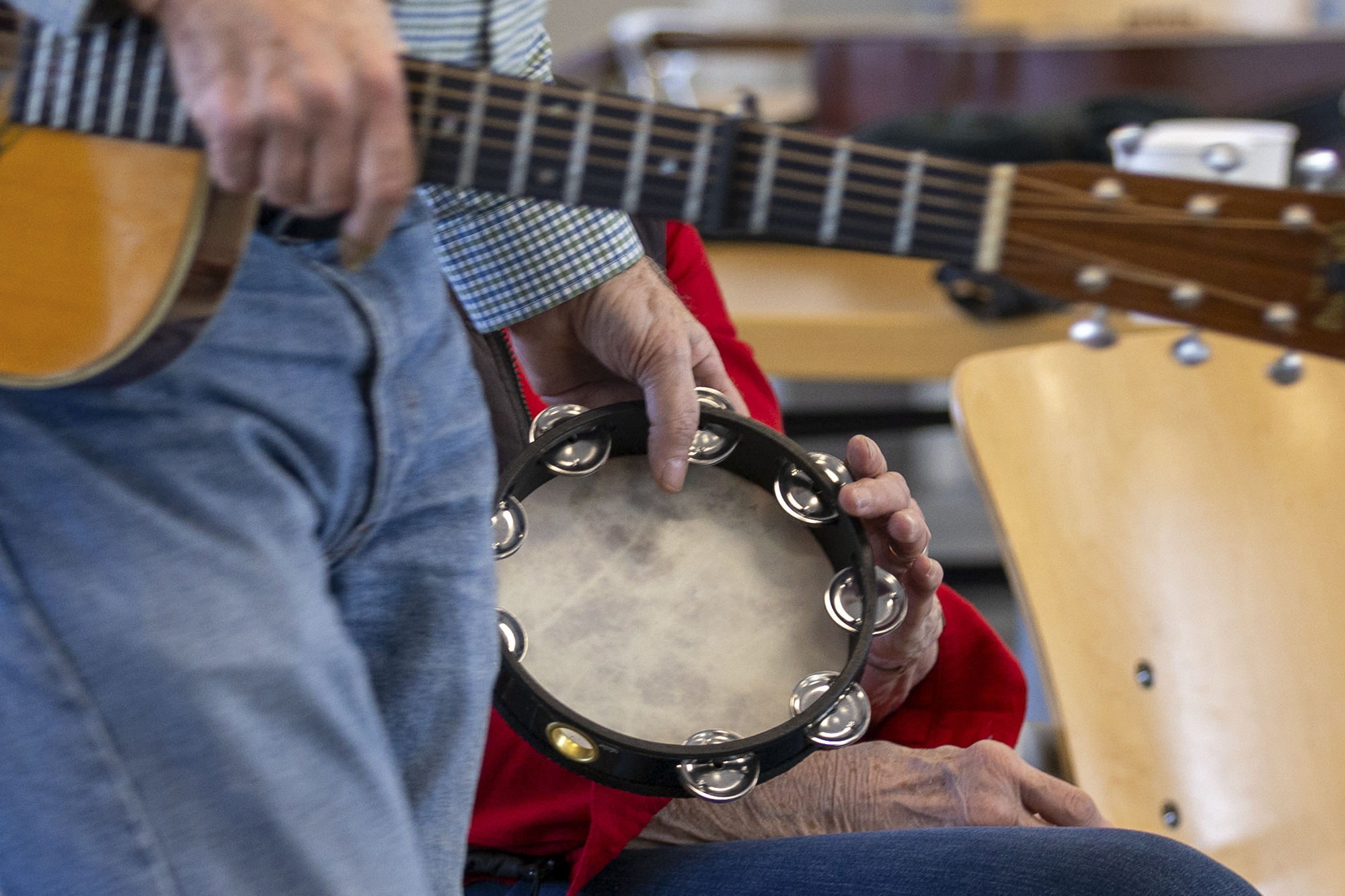 Joe Debellis passes a tambourine to Pat Ronzone during a Music Mends Minds group singing event hosted by Sutter’s Ray Dolby Brain Health Center at CPMC’s Davies Campus in San Francisco on Jan. 23, 2026. (Gustavo Hernandez/KQED)