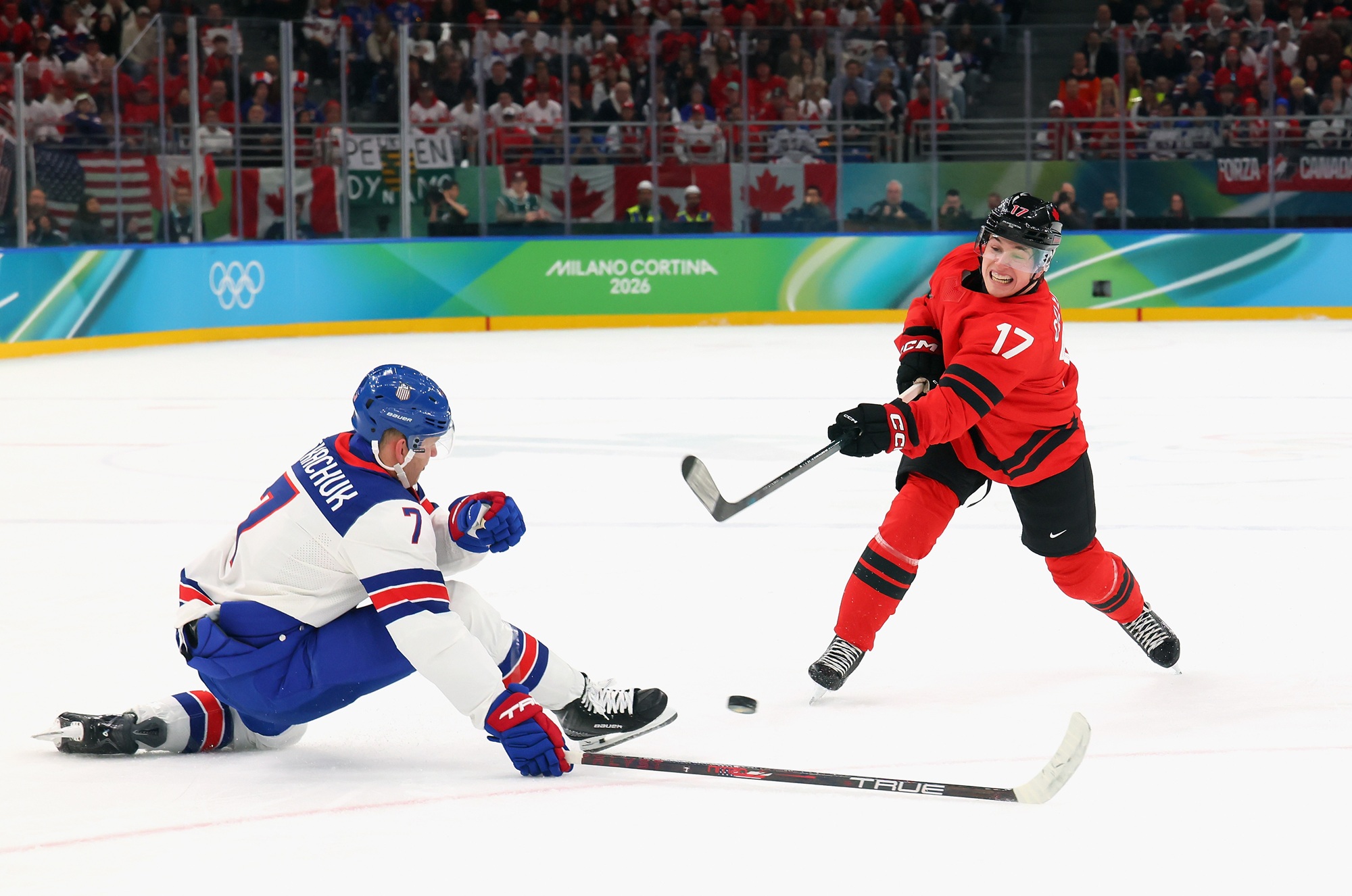 Brady Tkachuk #7 of Team United States blocks a shot by Macklin Celebrini #17 of Team Canada during the Men’s Gold Medal match on day 16 of the Milano Cortina 2026 Winter Olympic Games at Milano Santagiulia Ice Hockey Arena on Feb. 22, 2026, in Milan, Italy. The United States defeated Canada 2-1 in overtime. (Bruce Bennett/Getty Images)