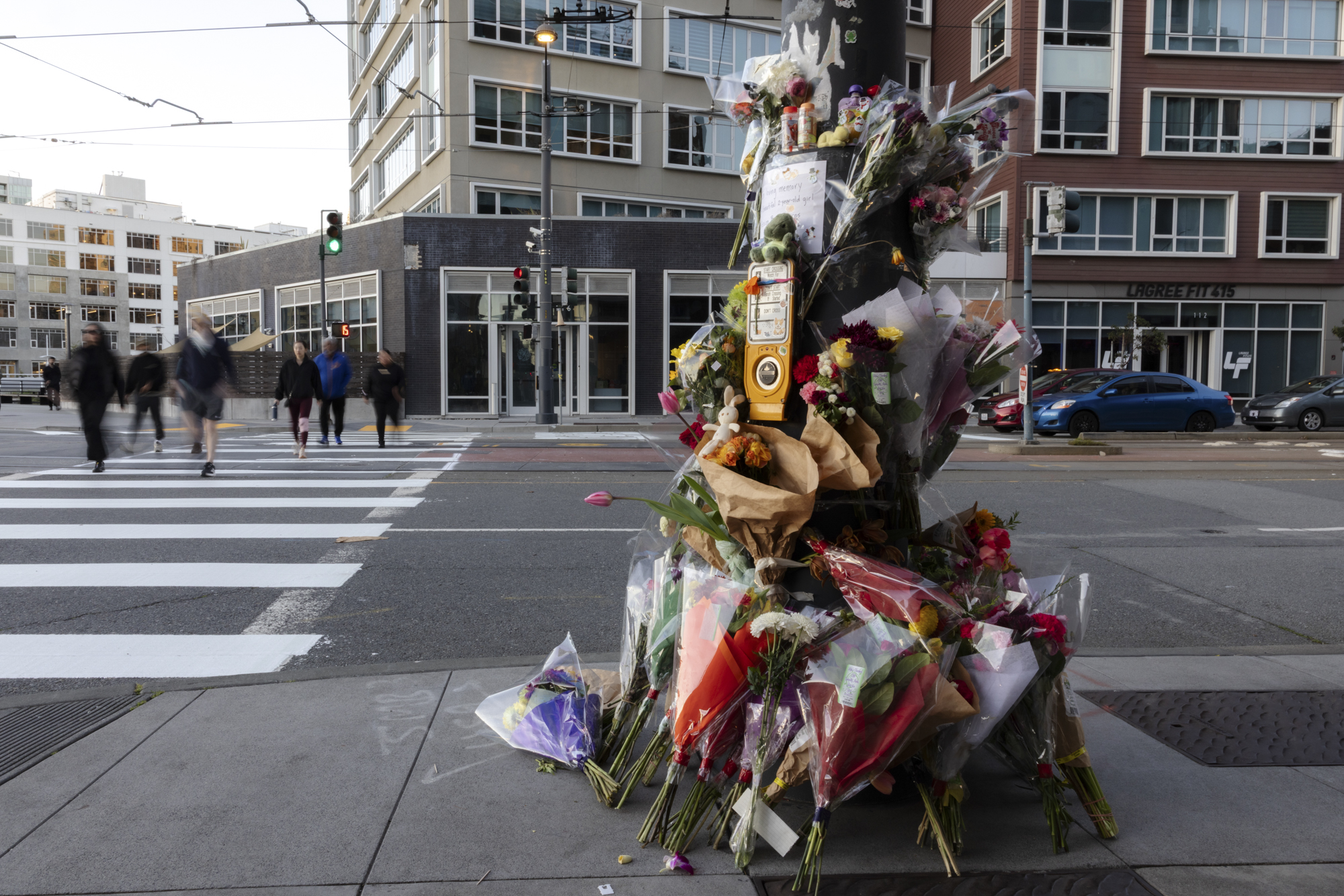 A memorial was arranged near the site where a 2-year-old girl was struck and killed by a driver at the intersection of on 4th and Channel streets in Mission Bay in San Francisco, on Monday, March 2, 2026. (Manuel Orbegozo for KQED)