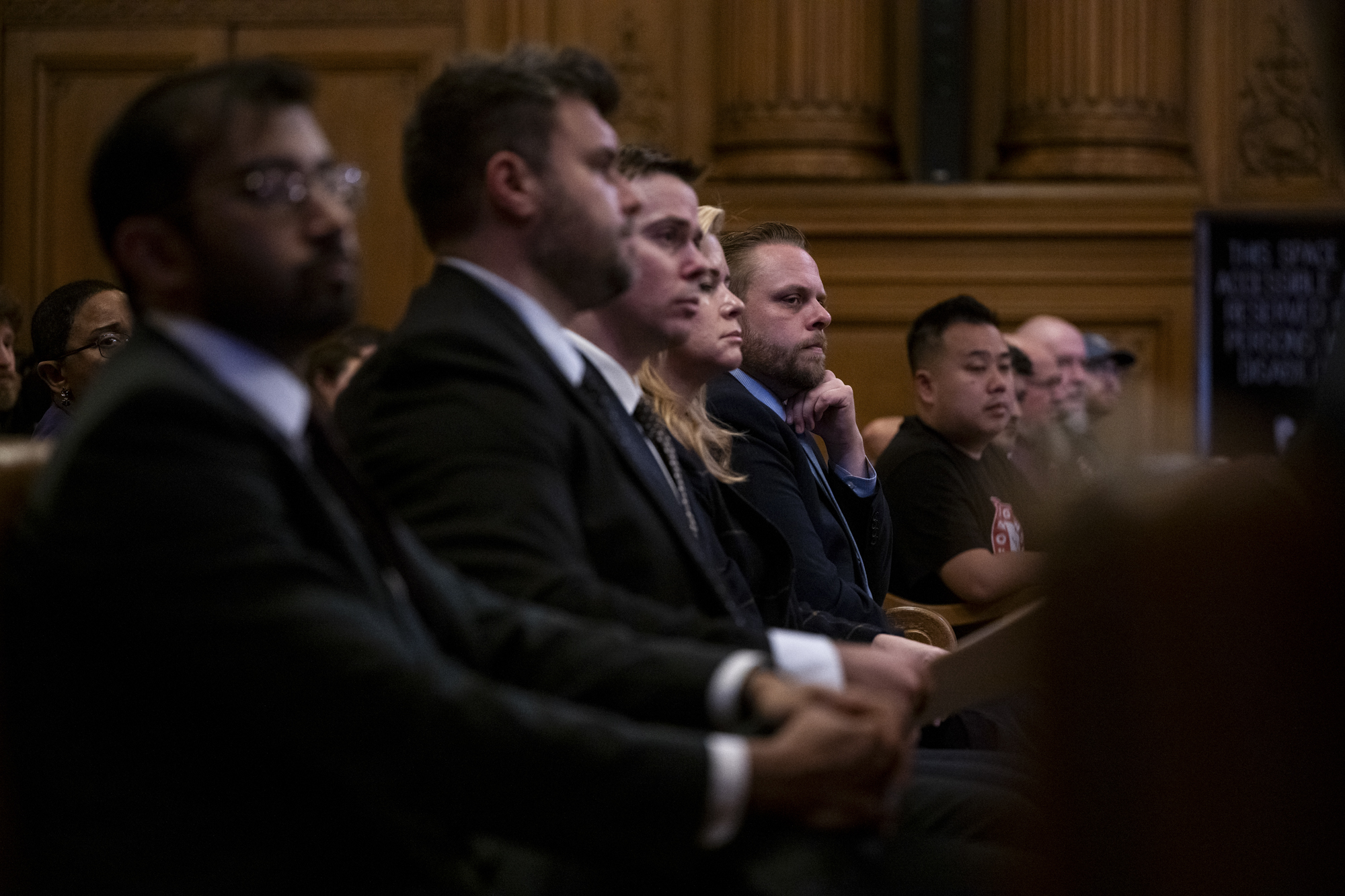 Waymo representatives wait to speak during a Board of Supervisors hearing on Waymo’s emergency operations at City Hall in San Francisco on March 2, 2026. A December power outage left Waymo’s autonomous vehicles stalled on city streets. (Beth LaBerge/KQED)
