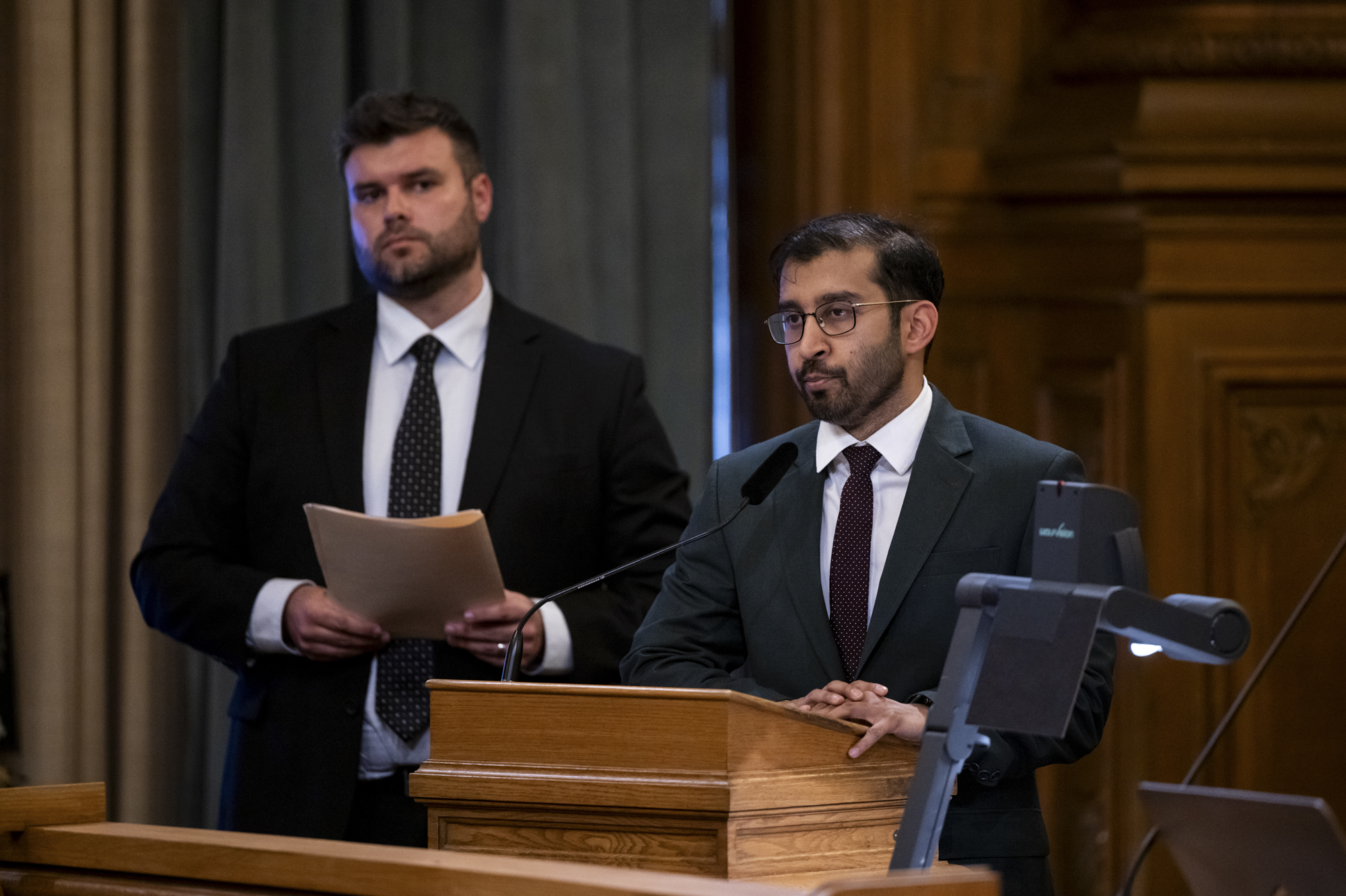 Chinmay Jain, director of product management at Waymo, speaks during a Board of Supervisors hearing on Waymo’s emergency operations at City Hall in San Francisco on March 2, 2026. (Beth LaBerge/KQED)