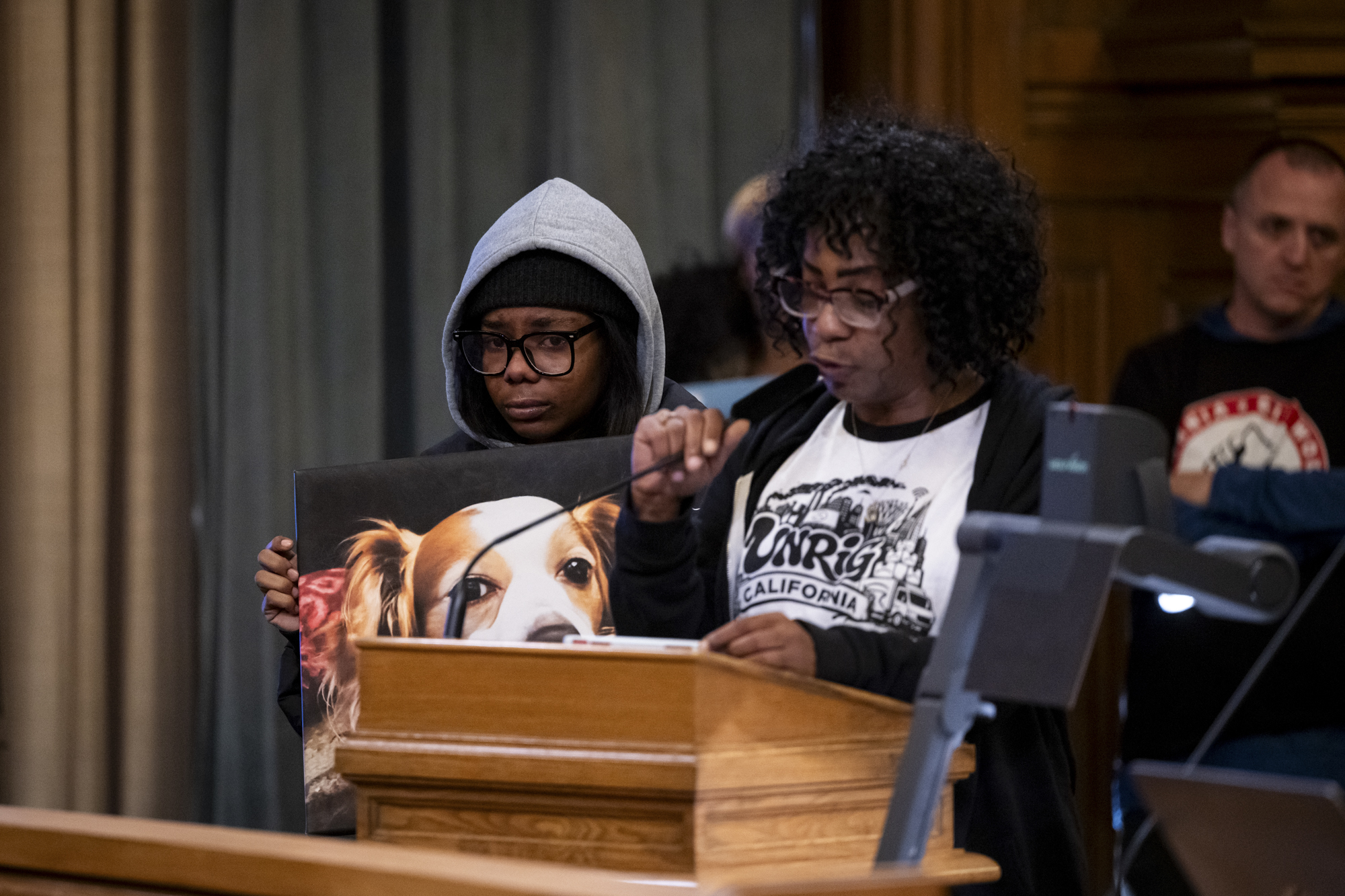 Kristin Hardy, region vice president for SEIU 1021, speaks on behalf of her daughter, Kayla Craig, whose dog, Leo, had to be put down after being hit by a Waymo, during a Board of Supervisors hearing on Waymo’s emergency operations at City Hall in San Francisco on March 2, 2026. (Beth LaBerge/KQED)
