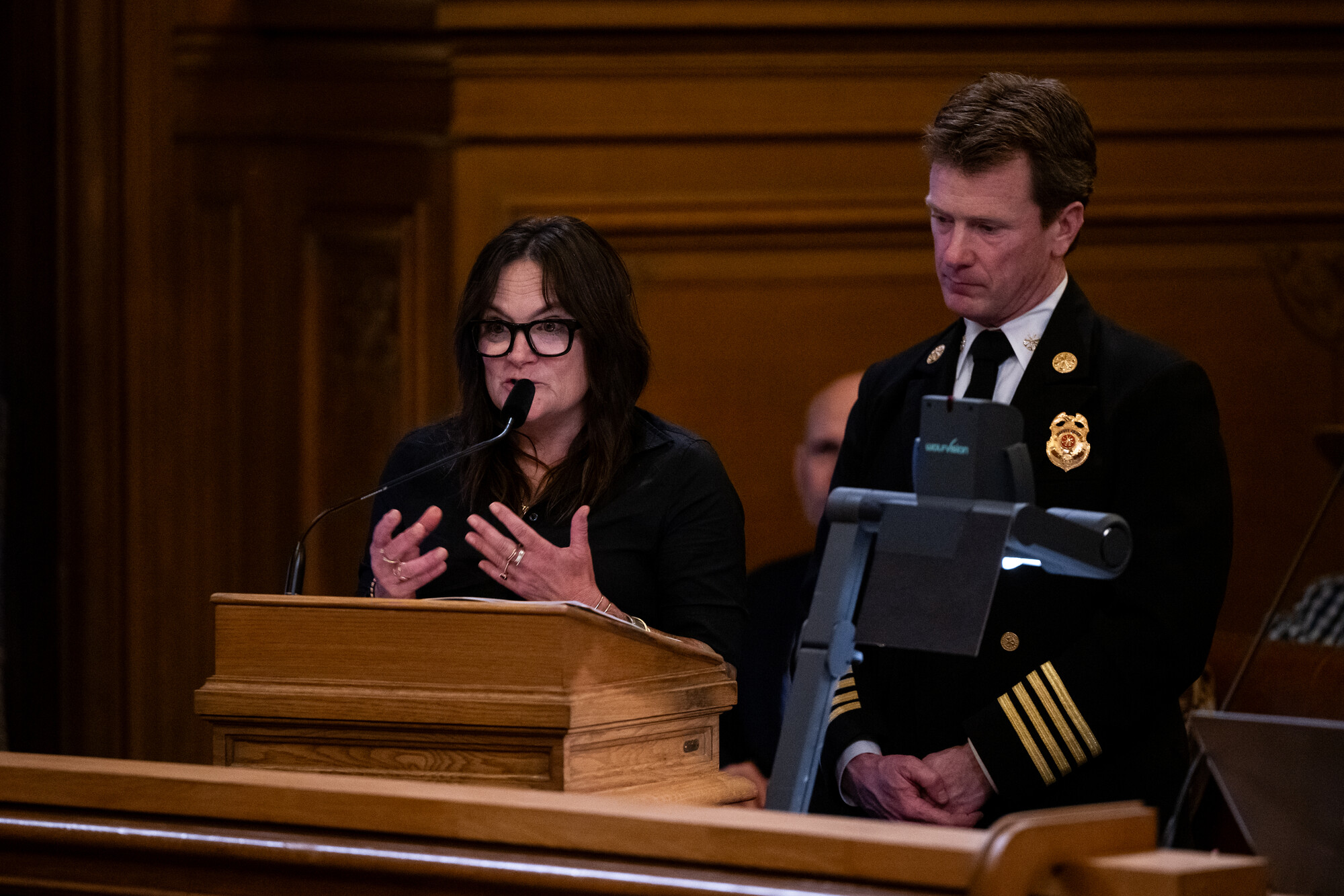 Mary Ellen Carroll, executive director of the San Francisco Department of Emergency Management, speaks during a Board of Supervisors hearing on Waymo’s emergency operations at City Hall in San Francisco on March 2, 2026. (Beth LaBerge/KQED)