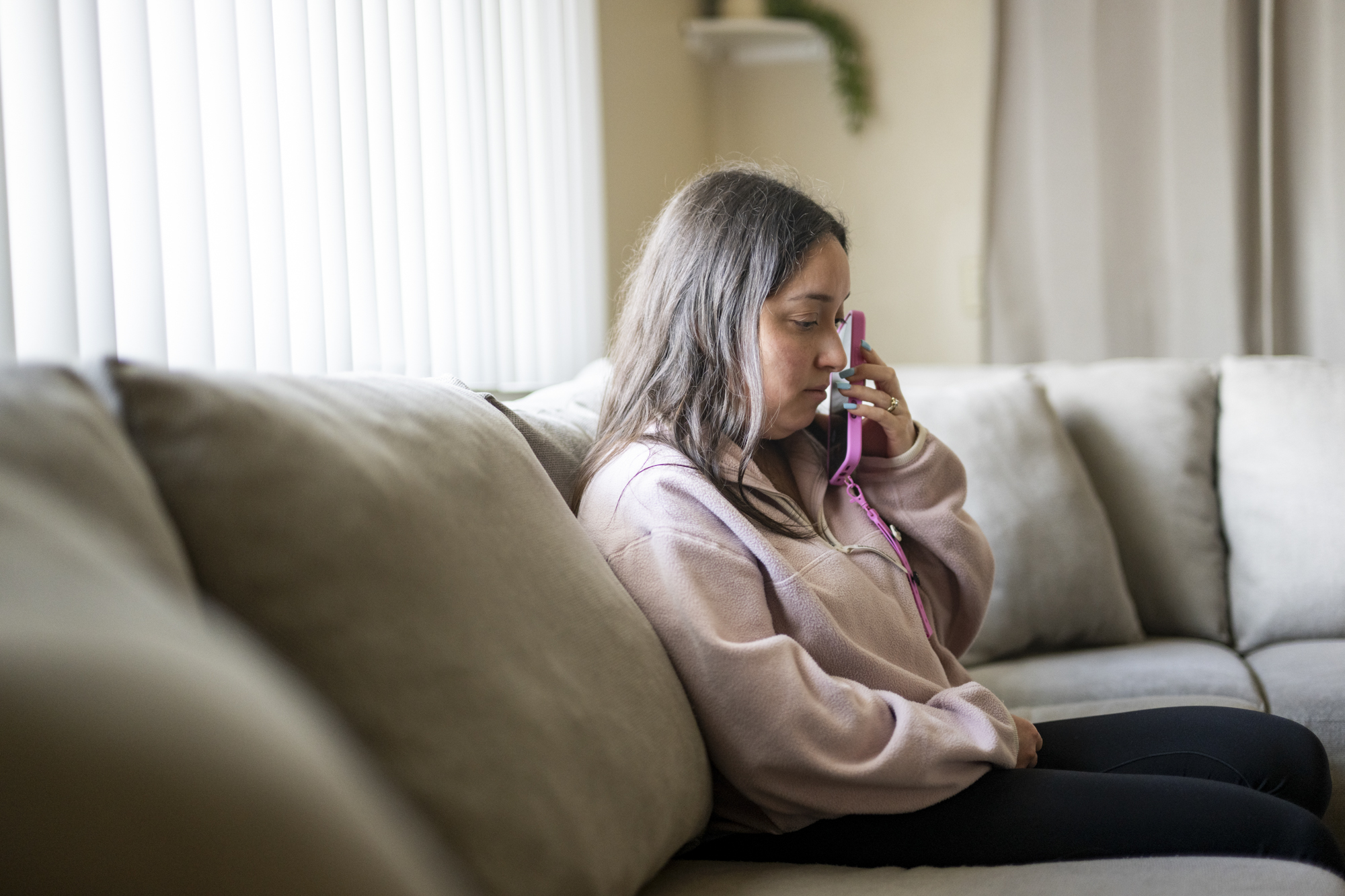 Aby Peña speaks by phone with her husband, Ulises Peña Lopez, from their home in Sunnyvale on Feb. 19, 2026. Peña Lopez was deported to Mexico after being taken into ICE custody outside their home in February 2025, leaving his wife and young daughter in the Bay Area. (Beth LaBerge/KQED)