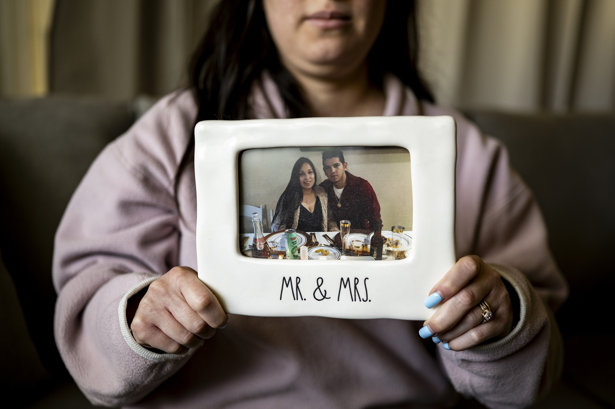 Aby Peña holds a photo of herself and her husband, Ulises Peña Lopez, at her home in Sunnyvale on Feb. 19, 2026. Peña Lopez, was deported to Mexico after being taken into ICE custody outside their home in February 2025, leaving his wife and young daughter in the Bay Area. (Beth LaBerge/KQED)