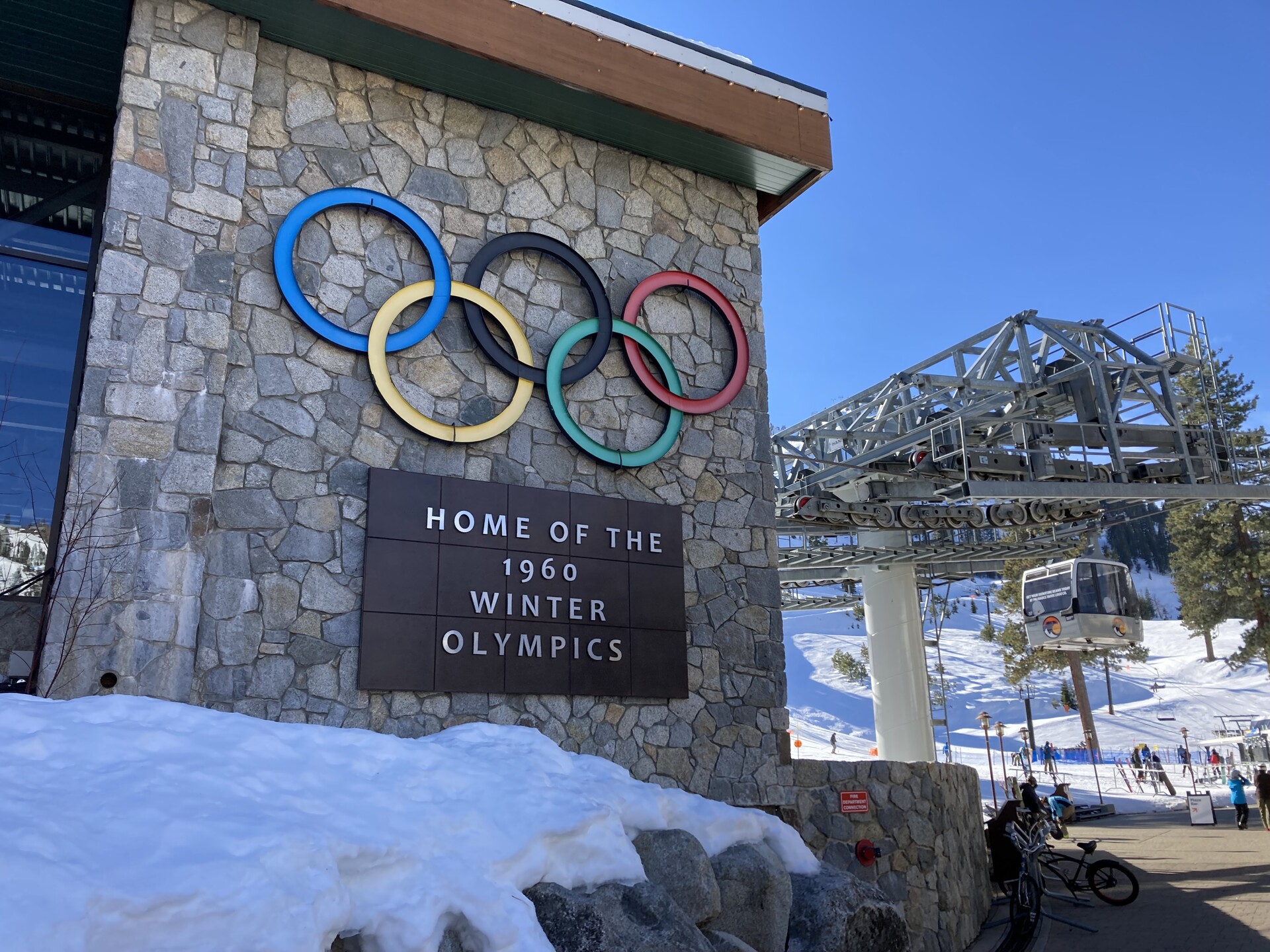 An Olympic symbol at Palisades Tahoe reminds visitors today of the ski resort’s history as host of the 1960 Winter Games. (Chloe Veltman/KQED)