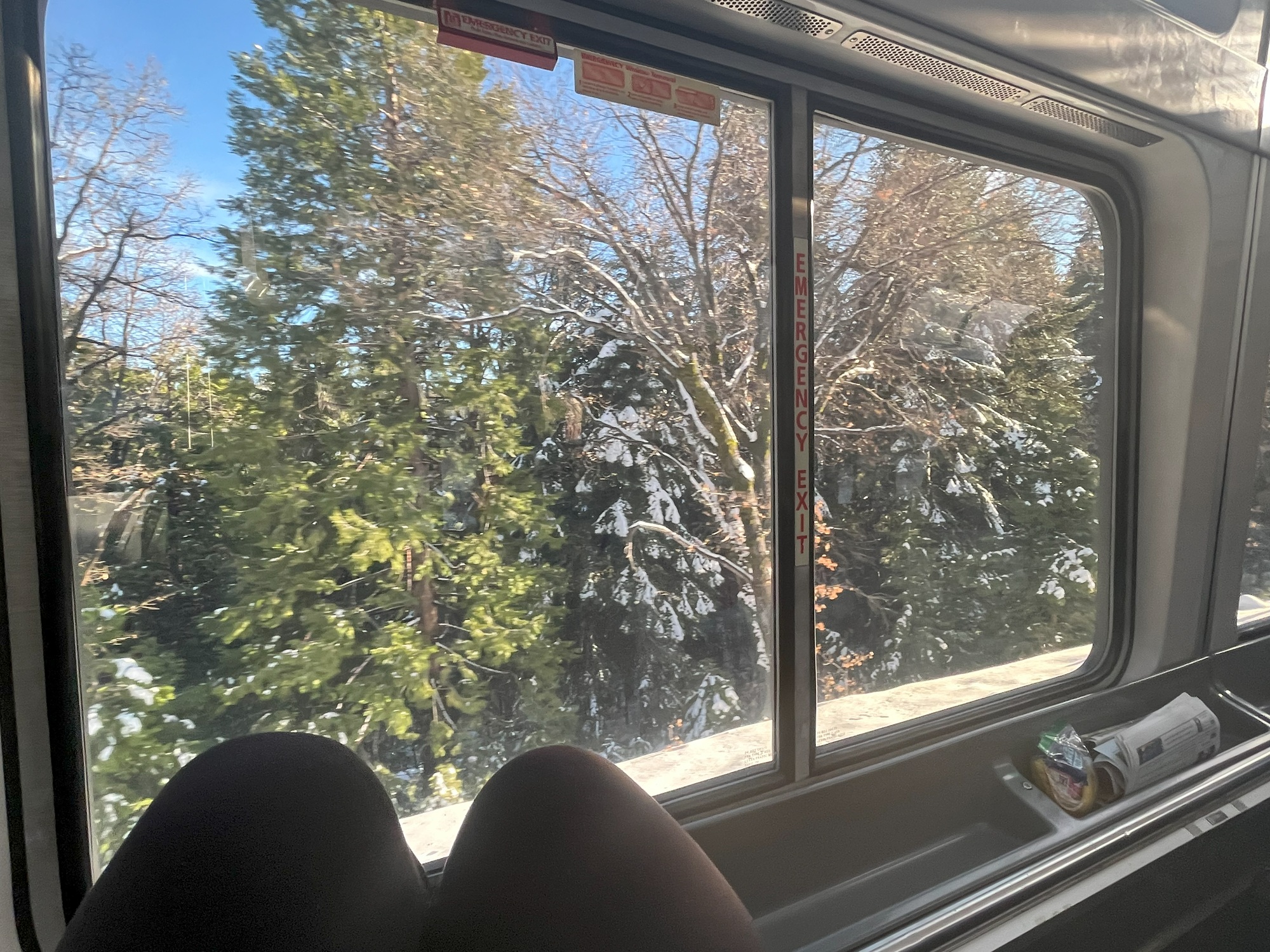 The mountain views on the way to Truckee in the observation car of the California Zephyr on Feb. 6, 2023. (Sarah Wright/KQED)
