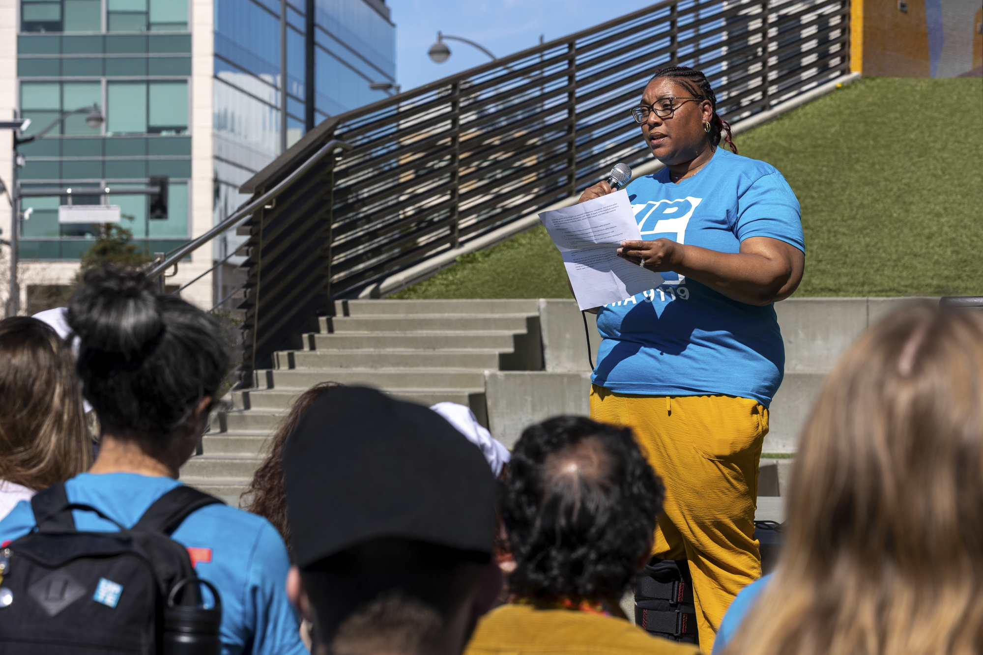 Tia Blackburn, a clinical social worker of four years, addresses workers and supporters during a rally outside UCSF Medical Center at Mission Bay in San Francisco on March 5, 2026, calling for stronger workplace safety protections following the fatal stabbing of social worker Alberto Rangel. (Gustavo Hernandez/KQED)